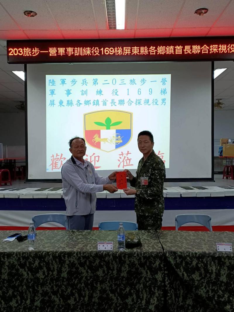 為使地方首長了解子弟在營服役現況,在屏東縣軍人服務站的積極聯繫辦理下促成探視活動,由屏東站專員袁光武今(29)日偕同屏東縣府役政科長簡茂峰,陪同縣內各鄉鎮首長等一行30餘人,前往探視及慰問陸軍軍事訓練役第149梯次役男,並期勉子弟們透過軍事訓練的洗禮,強健體魄,成為「在營爲良兵,在鄉爲良民」的典範。