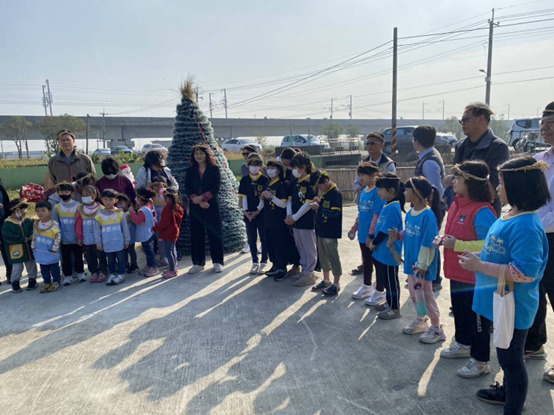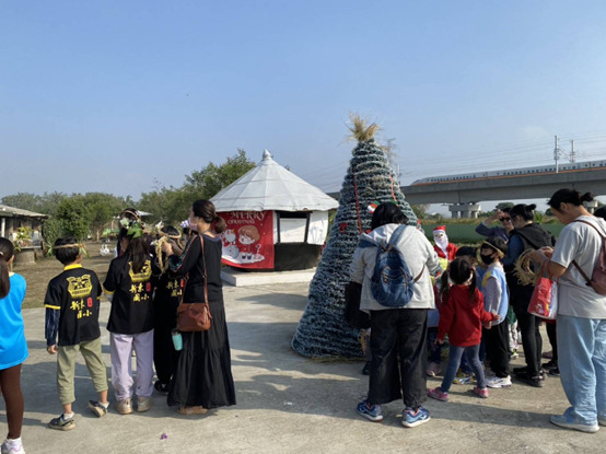 第二為「聖誕稻草樹」的共同創作。園區運用後壁在地稻草、落葉及自然枝材,打造具濃厚農村意象的聖誕樹,再由五校學童親手製作再生飾品進行妝點,完成一座兼具環保理念與文化美感的節慶地標,呈現後壁獨有的「永續聖誕美學」。