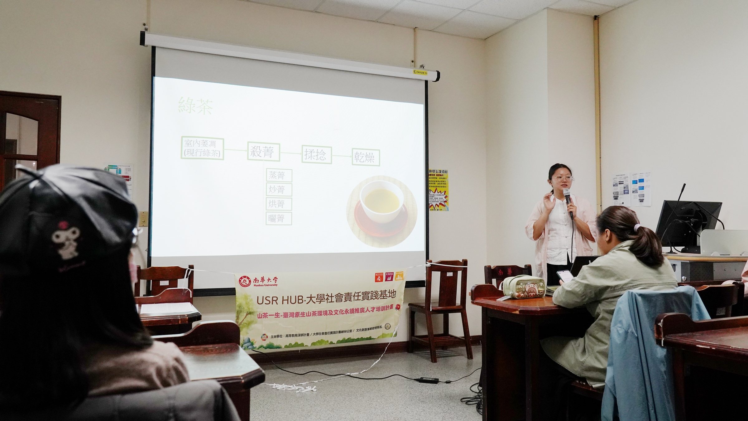 ►南華大學辦理山茶文化體驗,邀請「嘉木居」店長林菀亭進行專題演講,介紹臺灣山茶的歷史脈絡、現況與發展。