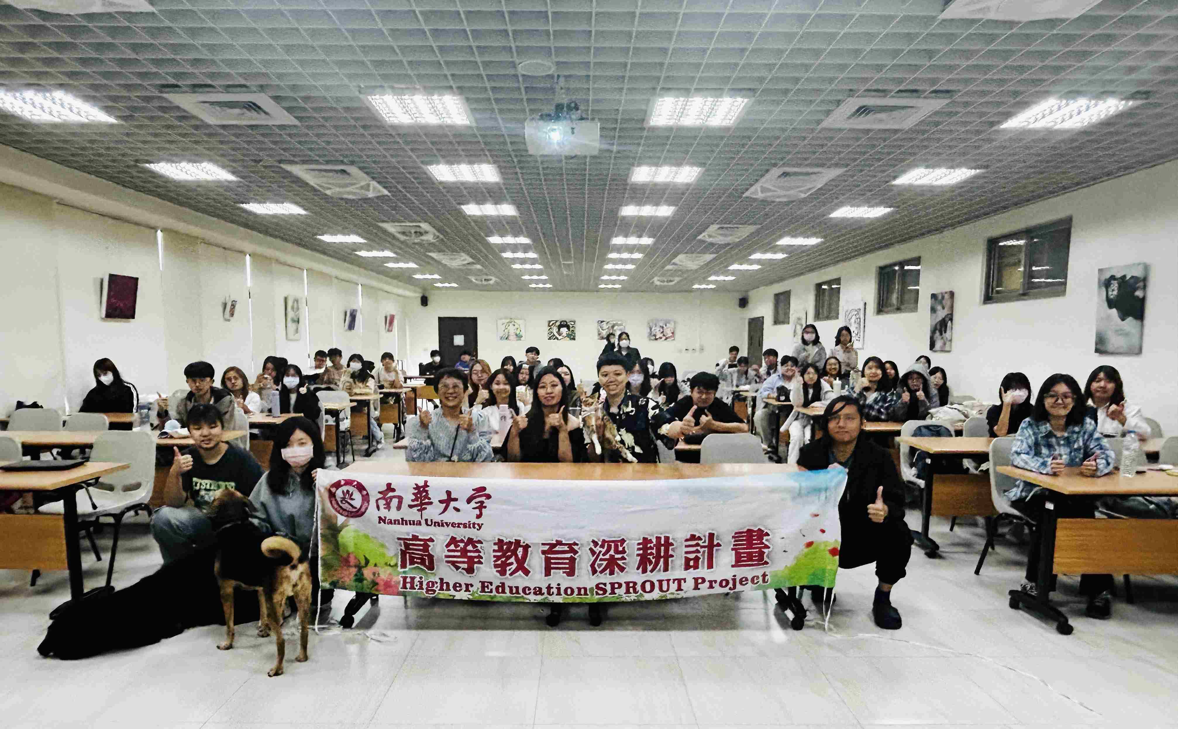 ►南華大學藝術與設計學院開設院跨領域課程「寵物行銷」,並邀請「米克斯寵物友善空間」經營者陳靖渝蒞校分享經驗,鼓勵學生與寵物互動。