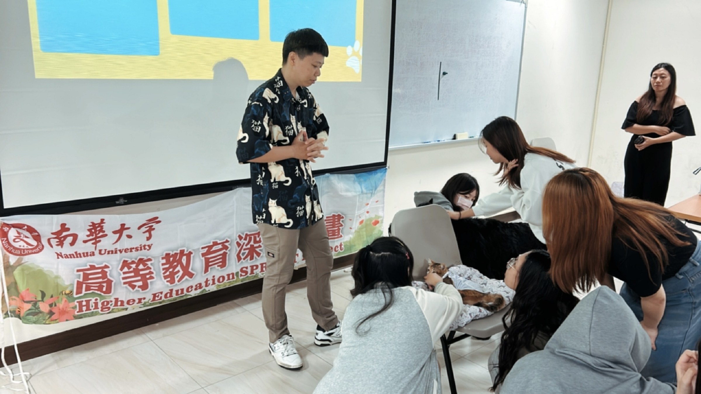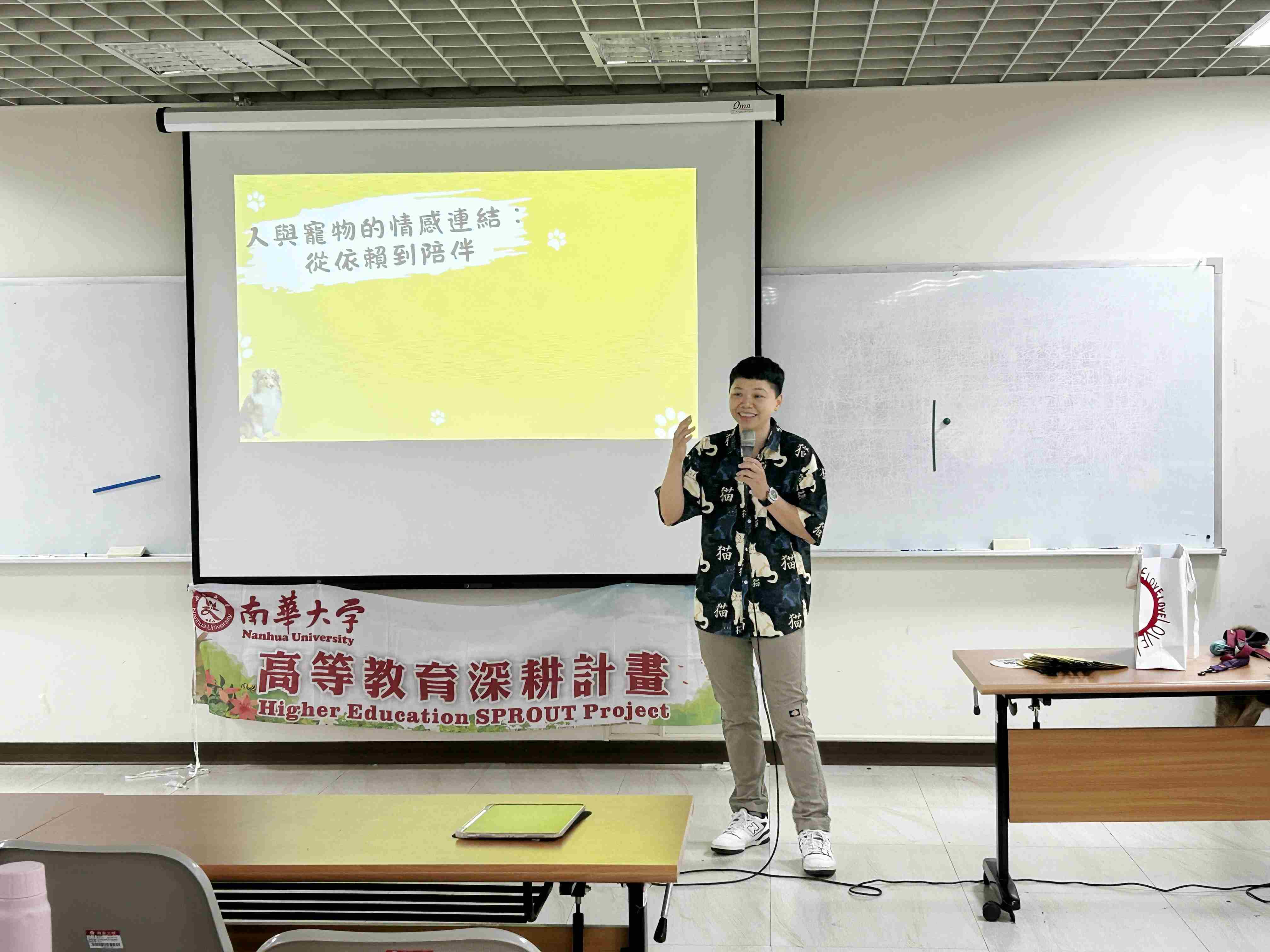 ►南華大學藝術與設計學院開設院跨領域課程「寵物行銷」,並邀請「米克斯寵物友善空間」經營者陳靖渝蒞校分享實務經驗。教導學生如何與寵物互動。