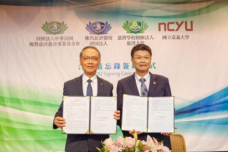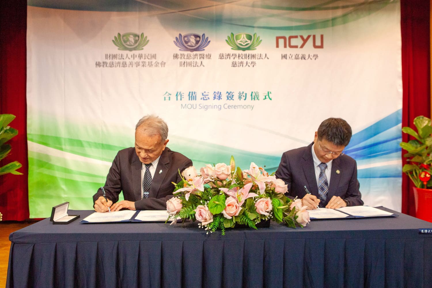 嘉義大學4月29日與慈濟大學、慈濟醫療財團法人及慈濟基金會分別簽署合作備忘錄,開啟跨校、跨機構、跨領域之深度合作。簽約儀式於花蓮慈濟大學隆重舉行,嘉大由林翰謙校長率洪滉祐副校長、陳瑞祥副校長及張俊賢副校長等多位一級行政主管11人出席,與慈濟基金會顏博文執行長、慈濟大學劉怡均校長及慈濟醫療財團法人林俊龍執行長等共同見證這場歷史性合作。此次合作涵蓋醫學教育、中醫發展、USR實踐、青年志工、永續行動及社會關懷等多元面向,展現雙方攜手共創教育共好與人文關懷的強烈企圖。