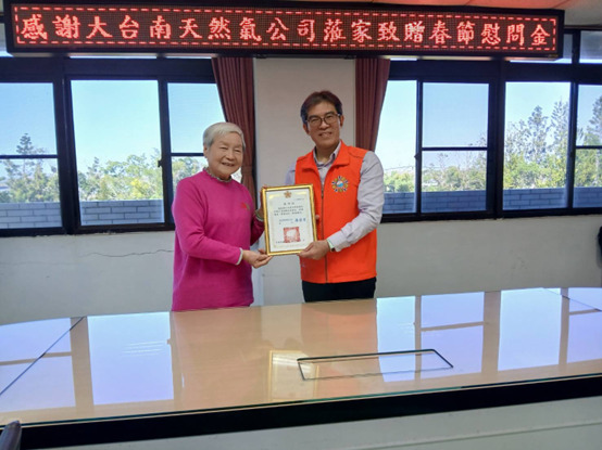 大台南天然氣公司董事長洪過表示,多年來一直秉持企業社會責任的精神,抱著感恩與回饋的心,向住民長輩致敬,尤其是榮民伯伯們年輕時為國家付出青春歲月,投入各項國家重大基礎建設工程,功在國家,是為社會之英雄,社會沒有忘記他們為這塊土地的犧牲奉獻,要在他們頤養天年之際,盡力好好照顧他們的晚年生活。