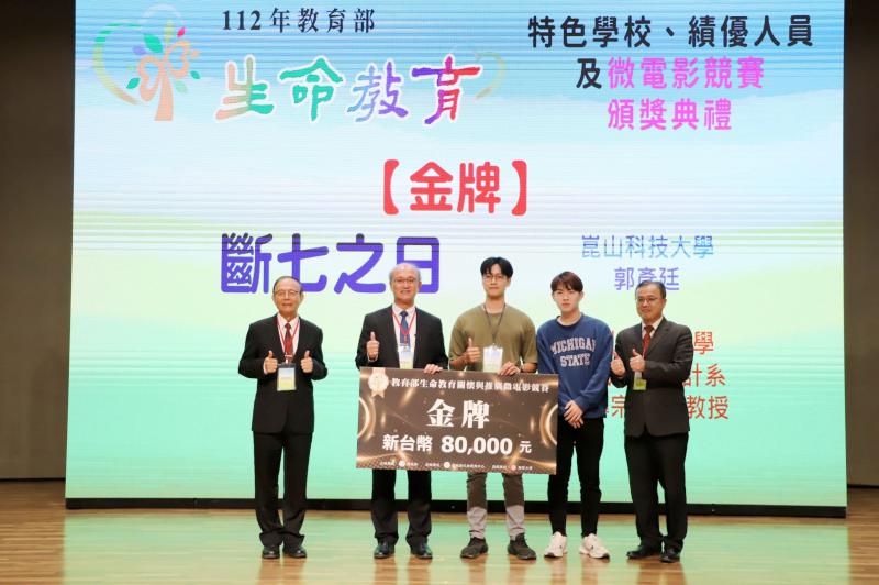 ►生命教育微電影競賽,由崑山科技大學以「斷七之日」之作品獲得金牌獎,並與教育部林騰蛟次長(左2)、學特司吳林輝司長(右1)、南華大學林聰明校長(左1)合影