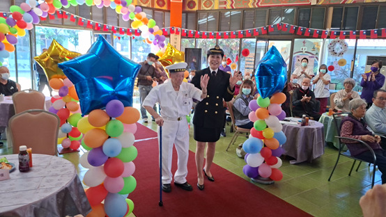 ►保健組組長牽著長輩進場,長輩穿著服役時的軍裝,場面活潑歡樂