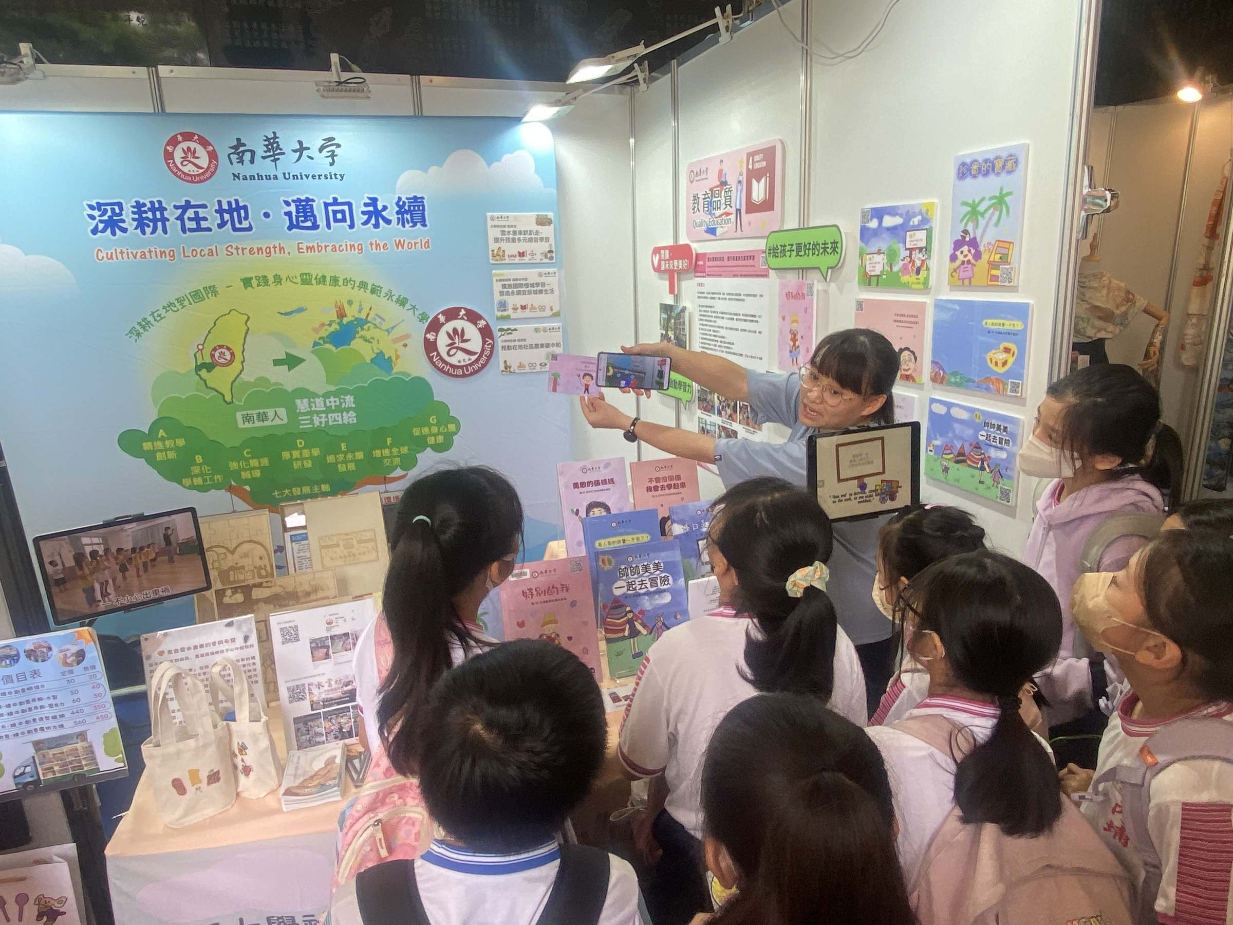 ►南華大學USR成果於佛光山佛陀紀念館參展,向蒞臨參觀的學童示範偏鄉孩童創作的AR互動繪本,展區人潮熱絡。