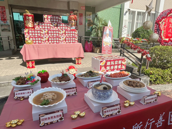 本次活動所發放的年菜,由在地知名總舖師阿泰師(施宗泰)除了自掏腰包全數捐助,也親自掌廚,共準備七道寓意吉祥、象徵團圓的年節料理,包括「騰馬迎春燉雞湯」、「招財進寶魚翅羹」、「吉祥如意雞米糕」、「金玉滿堂五彩魚」、「吉星高照大封肉」、「鴻運當頭大白蝦」及「富貴團圓八寶丸」,道道用心、香氣四溢,傳遞濃濃年味。