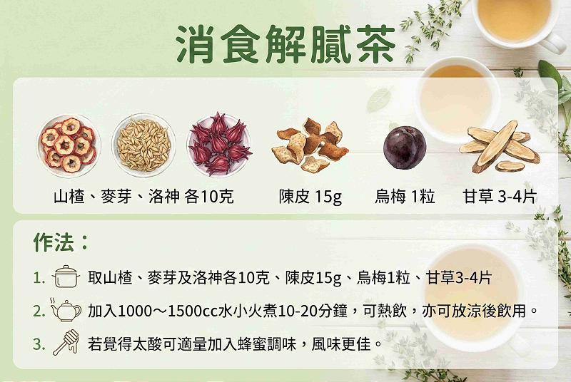 方則淳醫師推薦兩款中藥茶飲,讓大家享受美食後,去油解膩順便消脂。第一款是「消食解膩茶」,取山楂、麥芽及洛神各10克、陳皮15克、烏梅1粒、甘草3到4片,加入1000至1500毫升水,小火煮30分鐘,可熱飲,亦可放涼後飲用。若覺得太酸可適量加入蜂蜜調味,風味更佳。另一款是「清爽消脂茶」,取荷葉、桑葉各8克,菊花及決明子各10克,加入約1000至1500毫升水,小火煮30分鐘後即可飲用,體質偏寒的人亦可加入1到2片薑片調整。