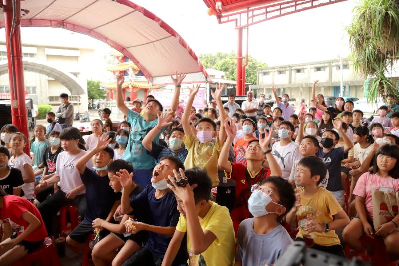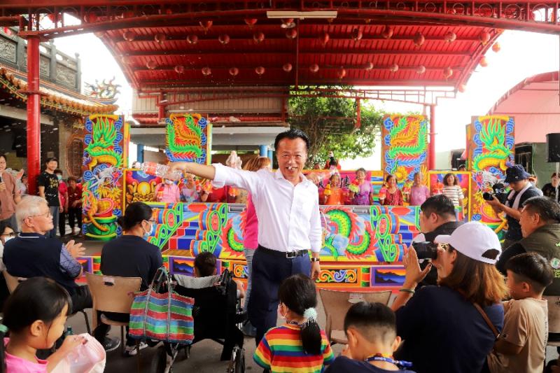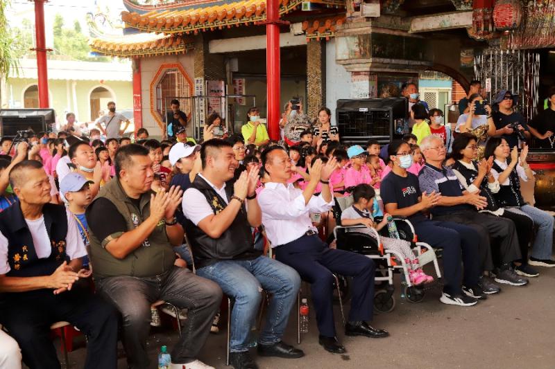 縣長翁章梁、六腳鄉長黃鉦凱、縣議員姜梅紅、詹琬蓁、雲嘉南區聯合服務中心副執行長李碧菁、灣南村長趙素娟、校長許瑞陽及文基會執行長陳尚雍等人與鄉親作伙看戲,廟埕一時間熱鬧滾滾。