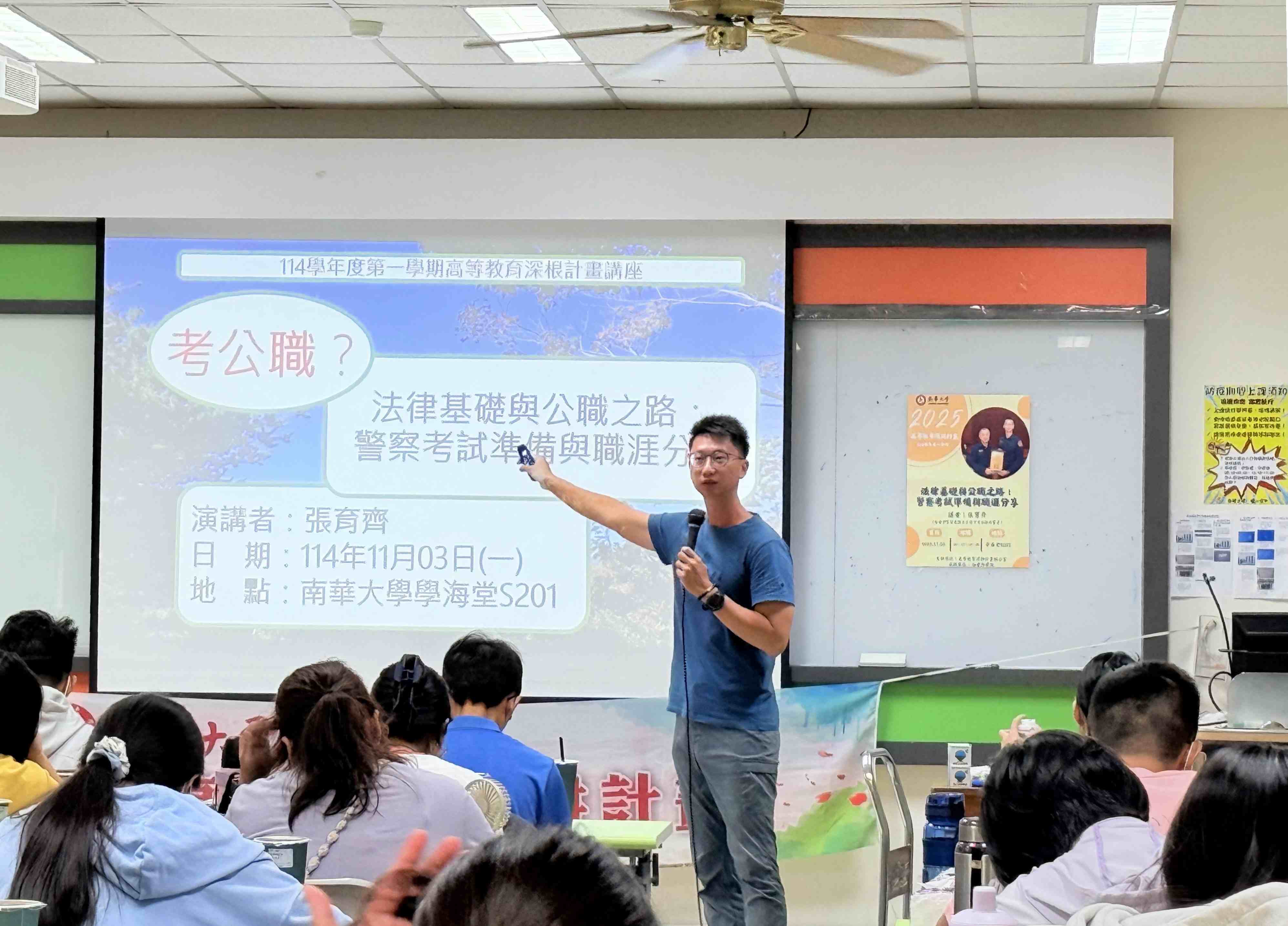 ►南華大學社科院推國考司法模組課程,邀請國際事務與企業學系畢業系友張育齊分享考取警察特考的經驗。