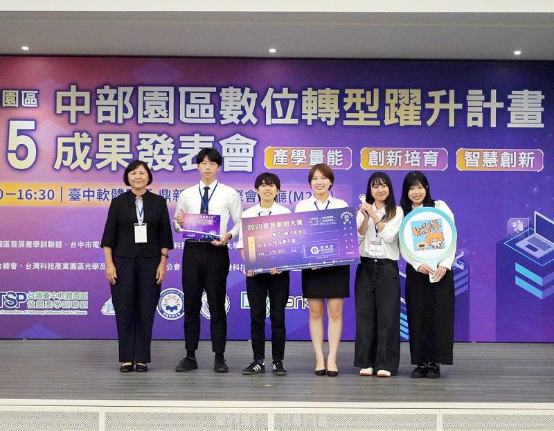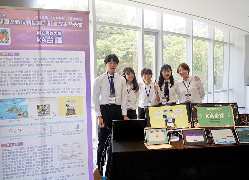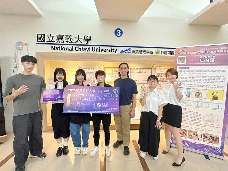 嘉義大學資訊管理學系李彥賢教授指導大四學生林芊廷、簡華萱、宋惠珊、施恒溱、鄭亦彣及林育豪,參加由經濟部產業園區管理局指導,臺中軟體園區發展產學訓聯盟、東海大學及精誠資訊股份有限公司等聯合舉辦的「2025臺灣數創大賞」,在全國大專校院181組參賽隊伍中脫穎而出,以「kà台譯-台語教學輔助系統」榮獲「數位+」組金獎及獎金新臺幣15萬元。這項創新成果完美結合AI與台語文化傳承,展現該系師生在數位創新與應用的卓越實力。