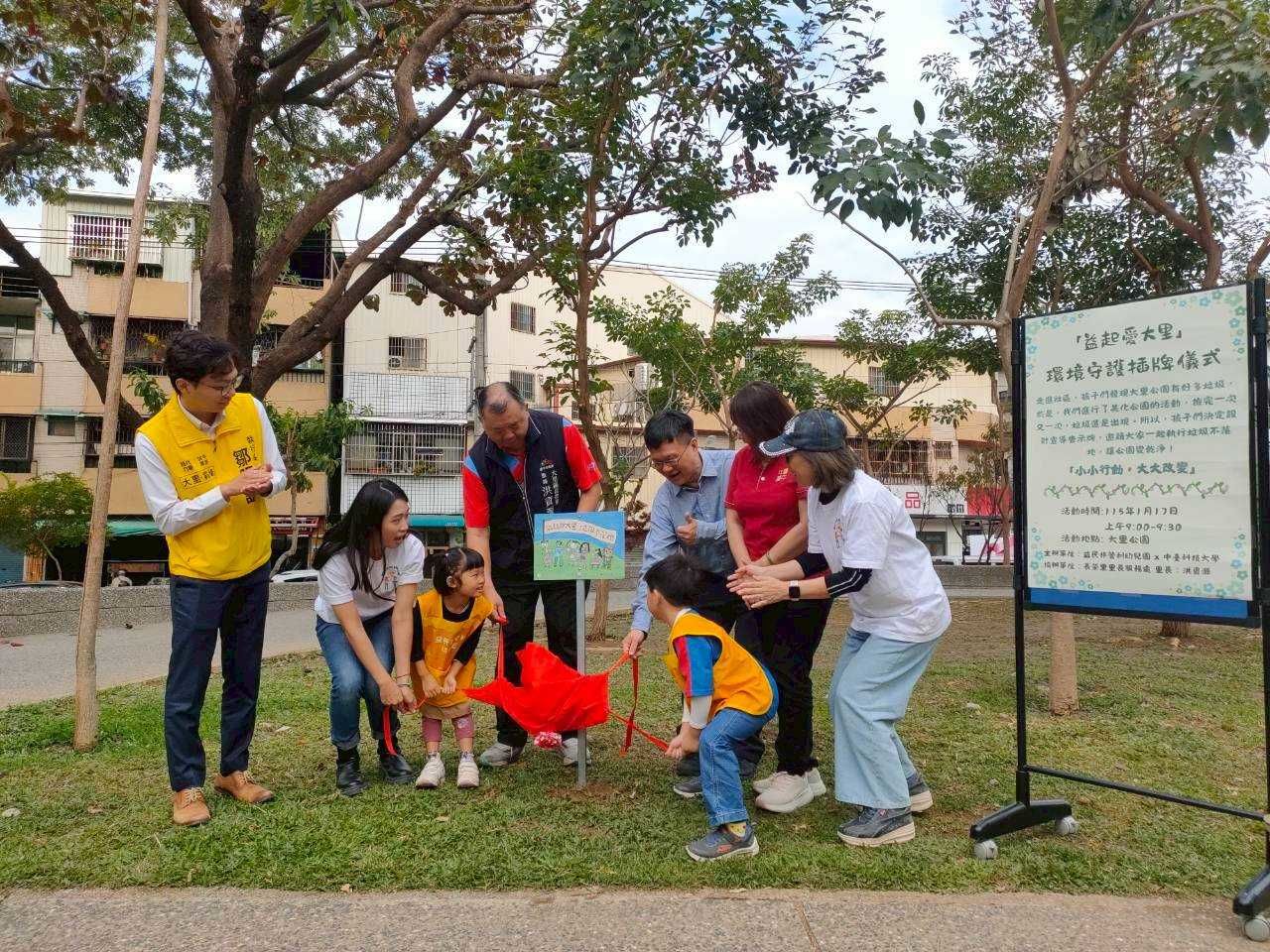 本次揭牌儀式源自於益民幼兒園本學期的特色課程「益起友好-我們的鄰居」。課程設計有別於傳統教室,教師團隊帶領孩子們走出校園進行深度的社區踏查。在一次次的探索中,孩子們敏銳地觀察到大里公園角落出現垃圾與髒亂問題,在老師的引導下,這群「小小公民」決定不再只是旁觀者,而是化身為「環保小尖兵」,不僅發揮創意與觀察力,更結合大里在地吉祥物「杙仔」,親手繪製與設計充滿童趣且具在地特色的環保宣導牌。揭牌儀式中,孩子們親手將宣導牌豎立在公園中,並以「益起愛大里,垃圾不落地」作為行動倡議,希望透過孩子們純真的聲音,提醒更多民眾共同珍惜與維護社區環境,此舉讓原本平凡的公園角落,瞬間充滿教育意義與人文溫度。