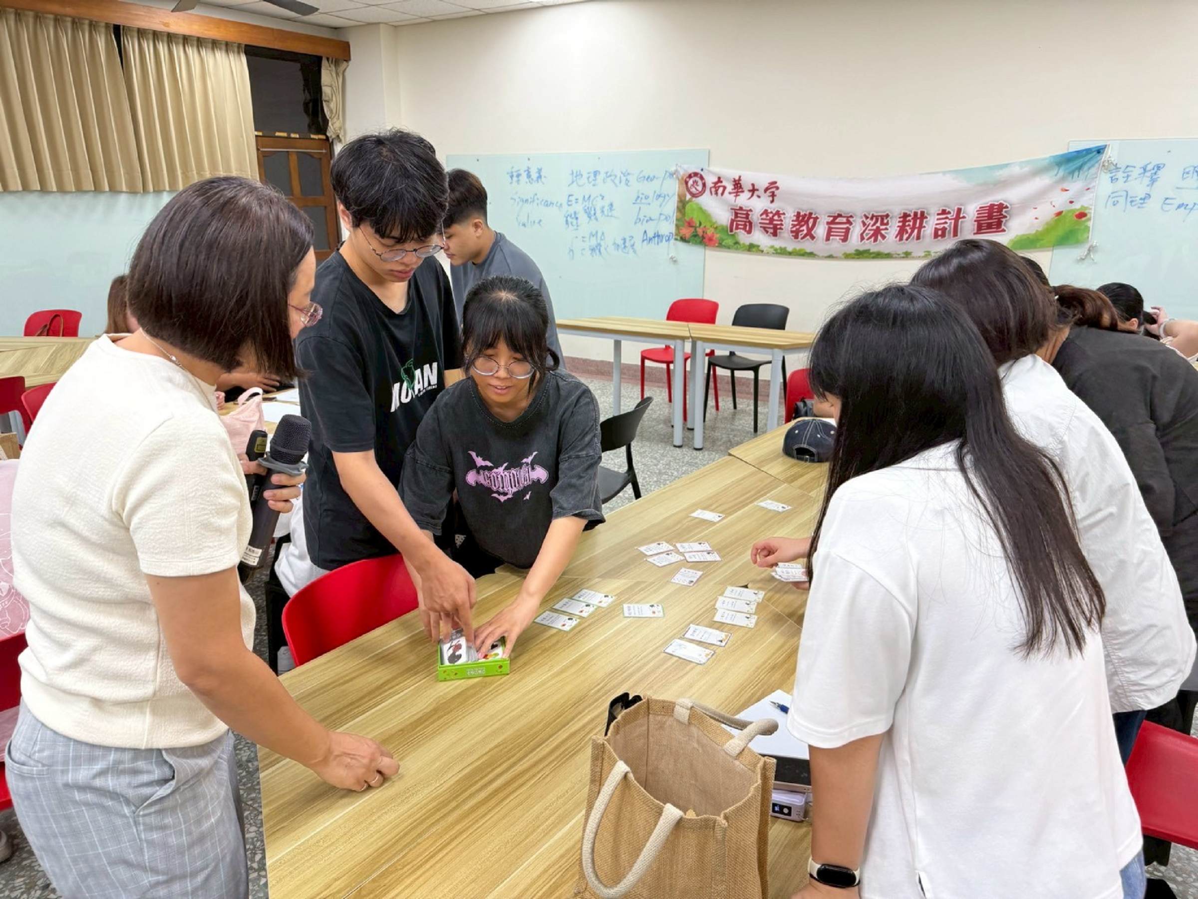 ►南華大學職涯培力升級,深化學生職涯競爭力,辦理職涯探索工作坊,講師引導學生透過卡牌認識自己。