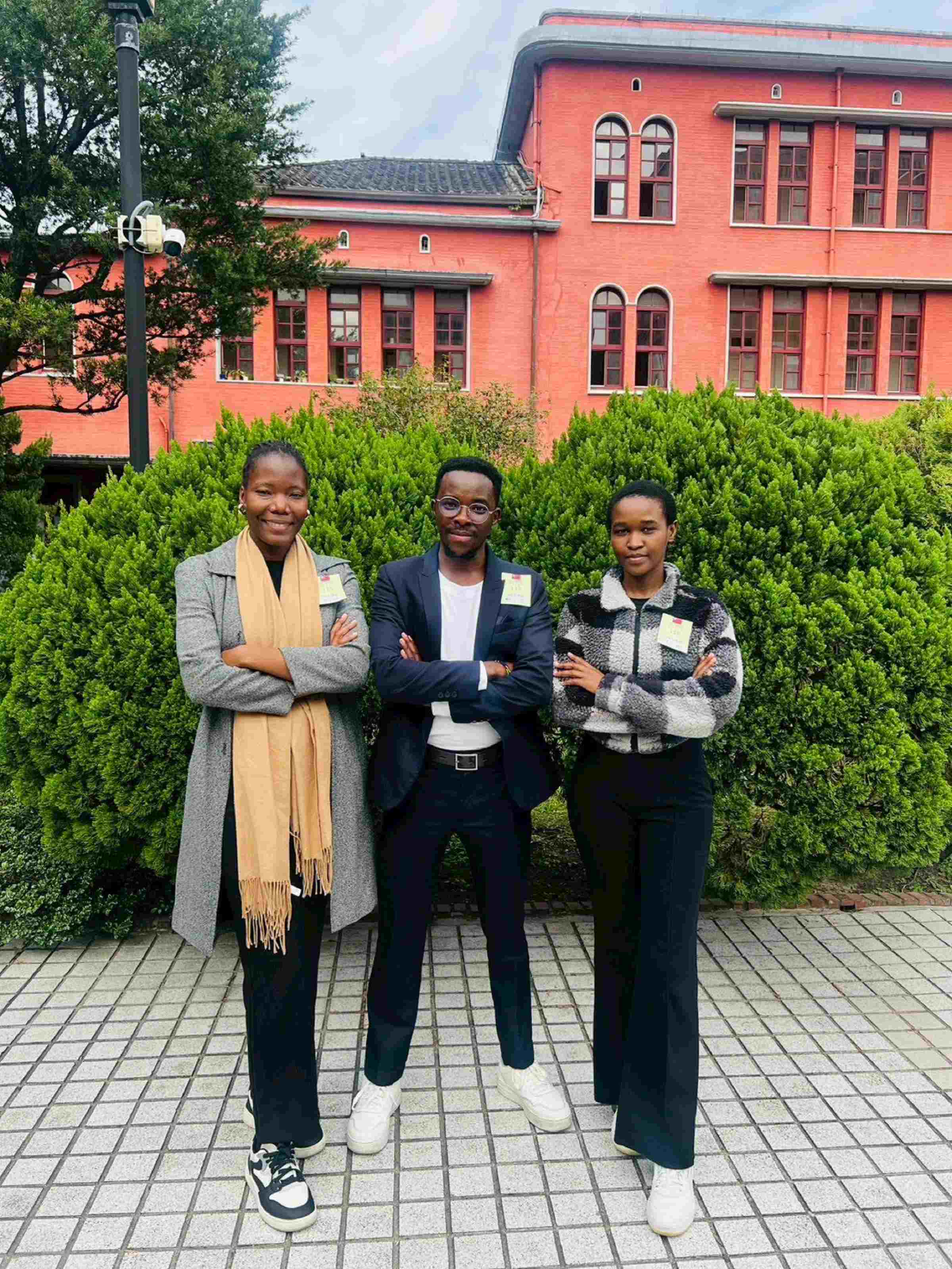 ►南華大學國際生受邀出席「全球國際交流合作・共榮共融」活動,分享返鄉實踐永續行動。左起馬拉威籍沐語彤、坦尚尼亞籍麥可、史瓦帝尼籍藍安淇。