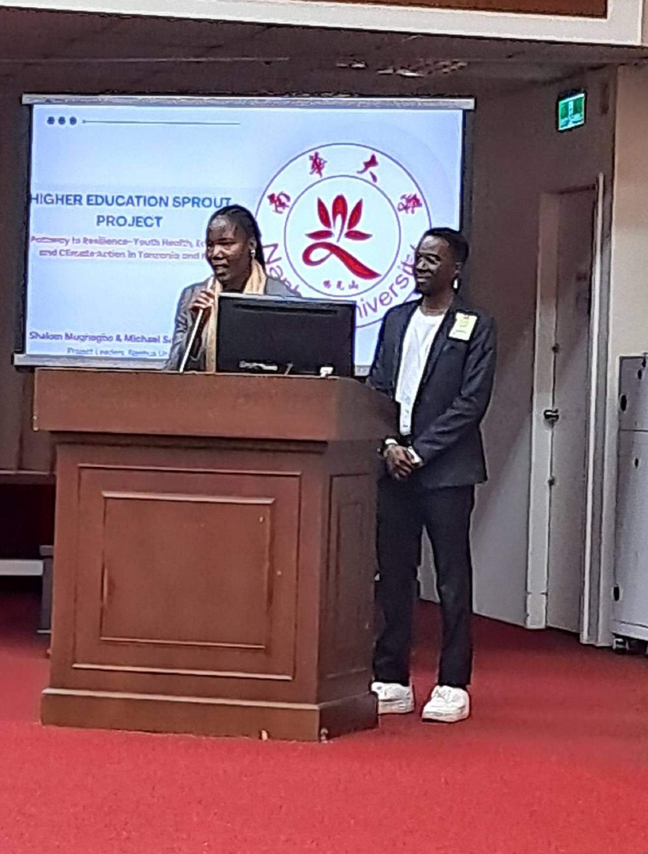 ►南華大學國際生受邀出席「全球國際交流合作・共榮共融」活動,分享返鄉實踐永續行動。馬拉威籍沐語彤(左)、坦尚尼亞籍麥可(右)。