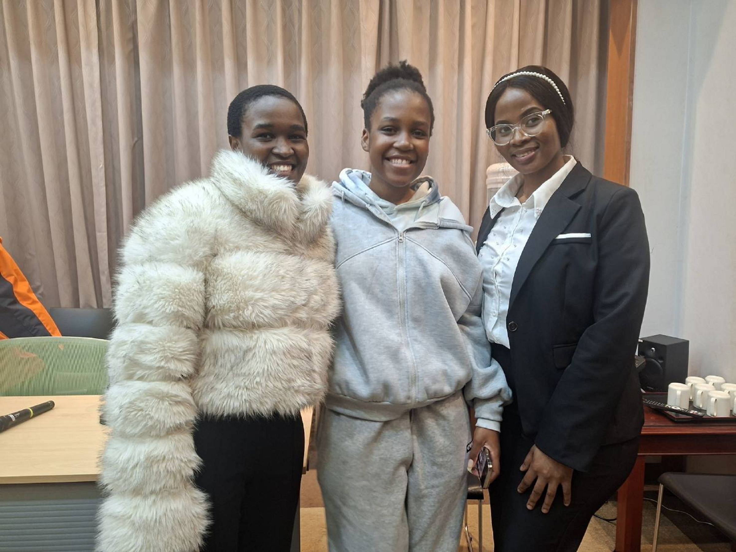 ►南華大學國際生史瓦帝尼籍藍安淇(左)受邀出席「全球國際交流合作・共榮共融」國際交流記者會,並與友校同鄉史瓦帝尼籍學生合影。