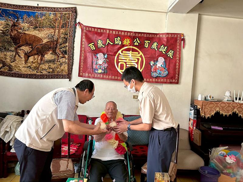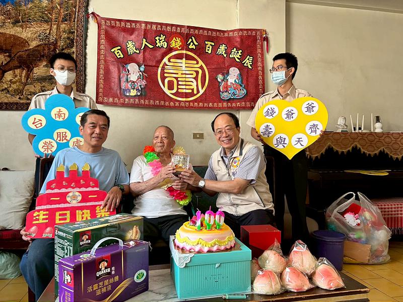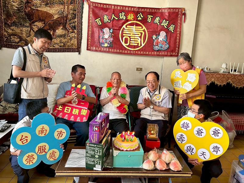 榮民錢秉有爺爺百歲嵩壽,臺南市榮服處王國能處長於今(8)日帶領該處責任區輔導員、榮欣志工、替代役等服務團隊,至榮民錢秉有爺爺家裡舉辦溫馨的百歲慶生活動。王處長特別代表輔導會嚴主任委員致贈琉璃壽桃金飾,以表達國家對榮民戎馬一生的崇高敬意。