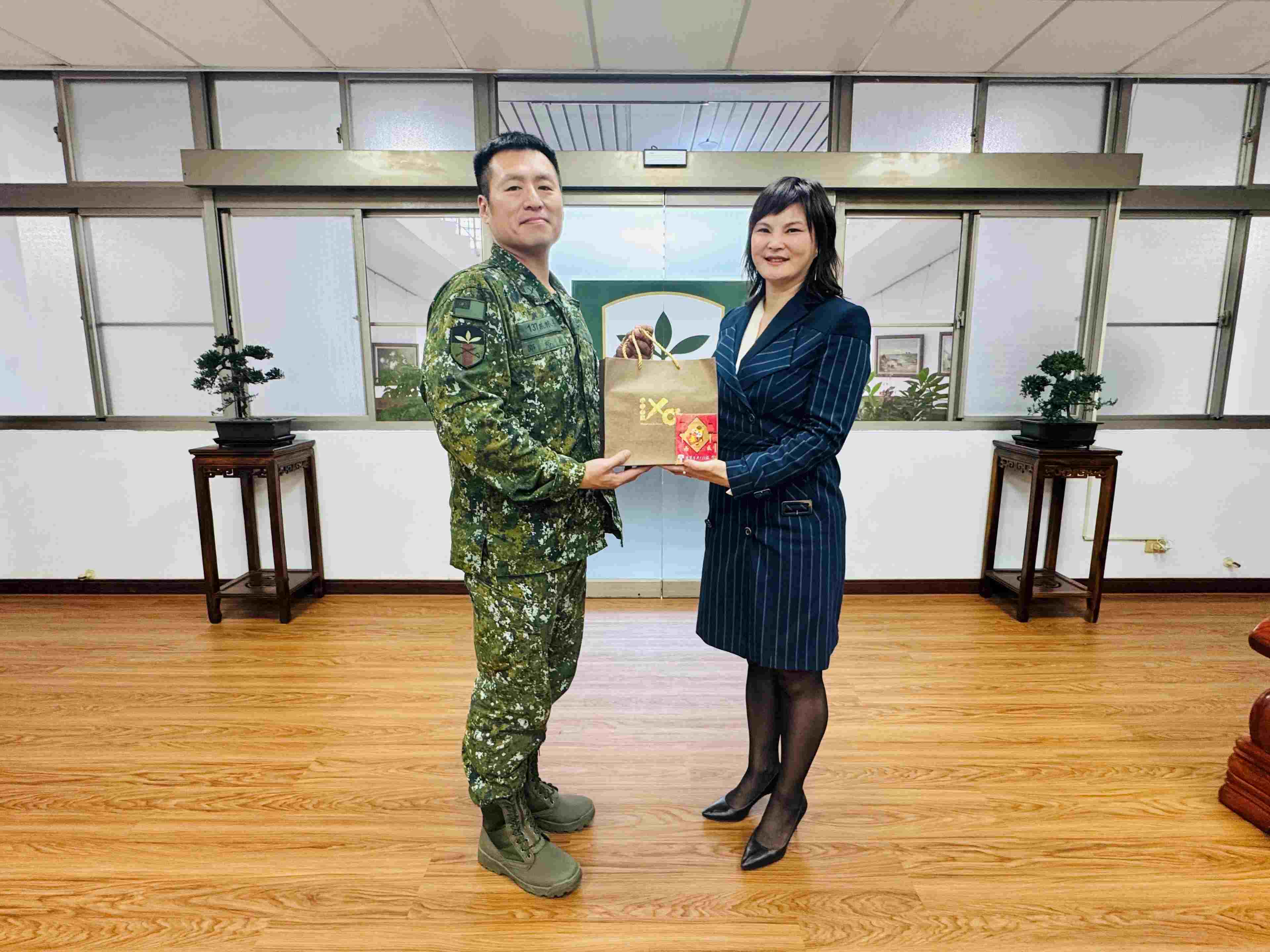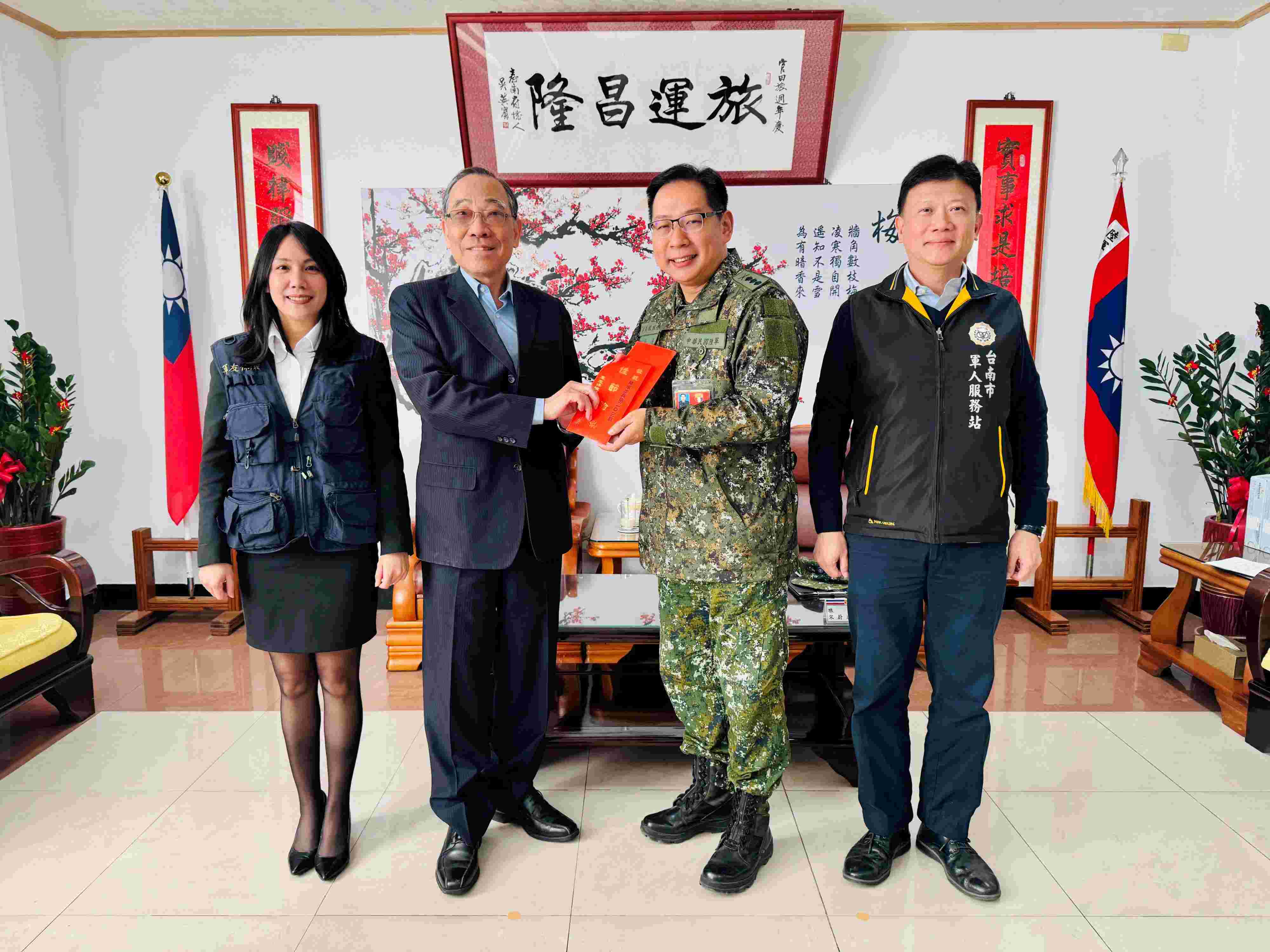 春節將屆,為表達對國軍官兵長期戮力戰備訓練,保家衛國辛勞的肯定與感謝,臺銀人壽專屬保代軍友保險公司敬軍團由總顧問歐復興率領總經理黃秀芬及及所屬國軍急難慰助慈善協會理事長黃開森、副理事長陳育琳等人,在軍人之友社台南市軍人服務站站長劉可雲陪同下,前往陸軍203旅及陸軍137旅實施慰問,並致贈敬軍慰問金,受到官兵代表熱烈歡迎,充分展現「軍愛民、民敬軍」和「軍民一家親」的精神。p1