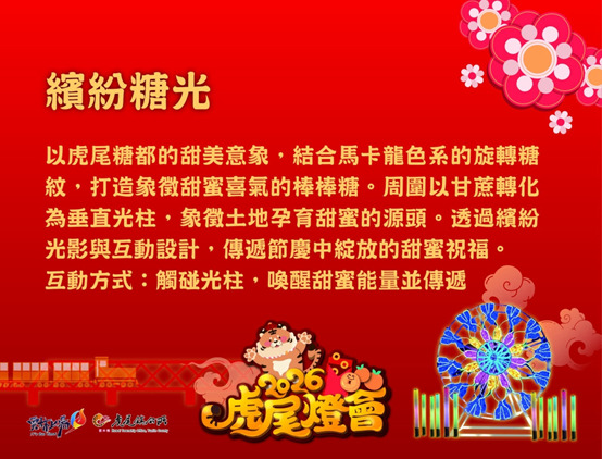 此外,2026虎尾燈會亦結合「台糖80週年」重要里程碑,向陪伴虎尾發展多年的糖業文化致敬。燈區設計融入方糖、鐵軌、甘蔗及虎尾盛產的洋桔梗等意象,透過藝術創作轉化為溫暖且富有故事性的主題燈組,讓民眾在賞燈過程中,細細品味虎尾與台糖交織而成的城市記憶與產業文化底蘊。