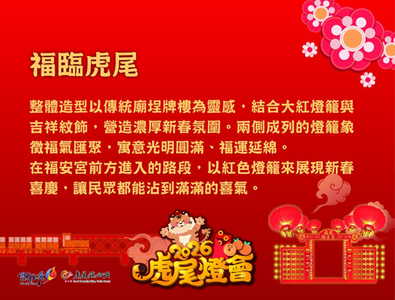 今年燈會以「點亮虎尾・虎馬閃耀迎新春」為主題,主燈區特別推出燈會專屬IP角色「虎尾虎」,以親民可愛的形象陪伴民眾走逛燈區,串聯互動體驗與拍照打卡活動,成為本屆燈會最具話題性的亮點,期望透過IP行銷深化虎尾城市品牌形象。副燈區則於虎尾糖廠信仰中心福安宮,結合糖廠媽祖意象,設置傳統廟埕牌樓、平安橋及祈福燈籠海,亦獨創祈福輪結合祈福燈組巧思,讓賞燈的民眾過平安橋、轉祈福輪,馬年平安轉運一整年。