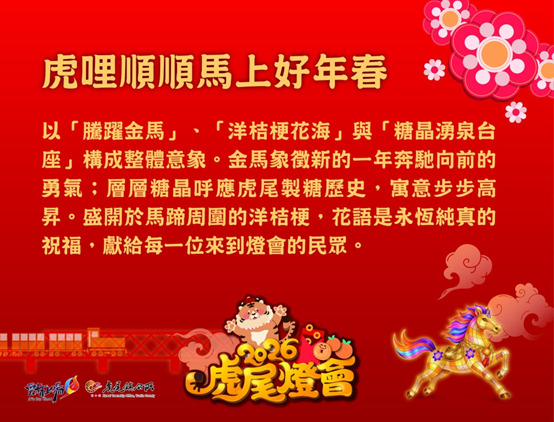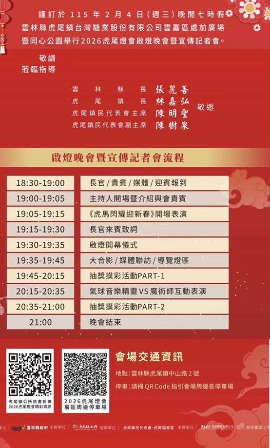 虎尾鎮長林嘉弘表示,虎尾燈會已成為地方重要文化品牌,今年透過「虎尾虎」IP角色與台糖80週年主題相互結合,不僅展現虎尾深厚的文化底蘊,也象徵城市持續創新與前進的能量。另指出,每年12月至隔年3月底為虎尾糖廠製糖期,正值燈會展出期間,民眾除可賞燈、走春祈福外,亦能感受糖業運作的季節氛圍,欣賞全台唯一五分車行駛的獨特景象。誠摯邀請全國鄉親攜家帶眷作伙來虎尾賞燈、走春祈福、品嚐在地美食,感受虎尾專屬的年節幸福。