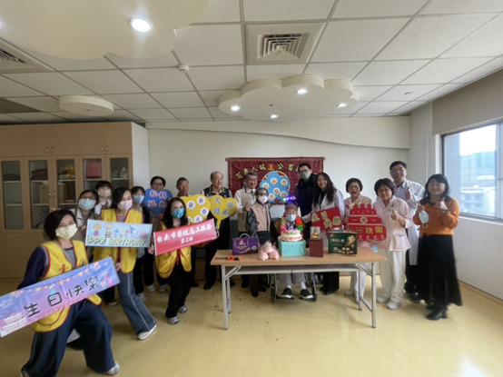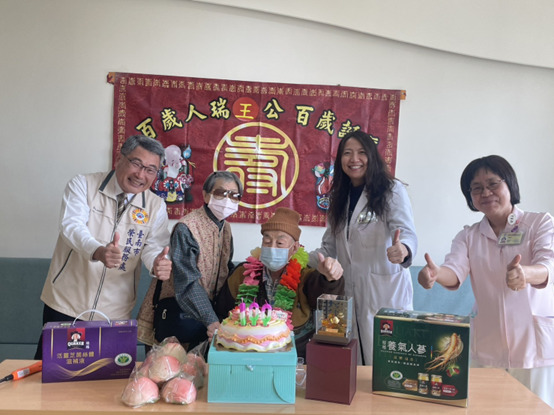 胡處長於現場帶領大家高唱〈生日快樂歌〉,祝賀王爺爺「福如東海、壽比南山」,氣氛熱鬧溫馨。家屬感謝榮服處與院方的關懷慰問,讓爺爺倍感溫暖。爺爺也笑著說,好久沒這麼隆重慶生,並感性勉勵大家:「做人不要太計較,只要配合醫院照護,人人都有機會成為百歲人瑞!」同時許下「大家都能健康快樂、呷百二」的祝福。