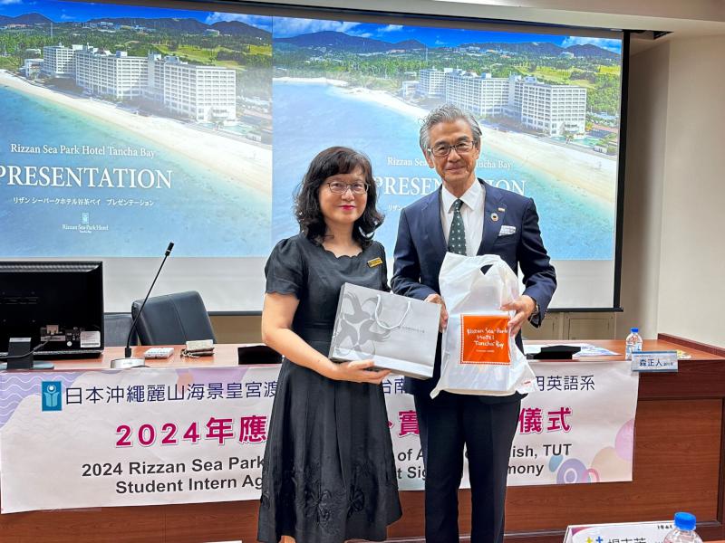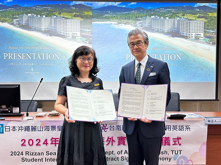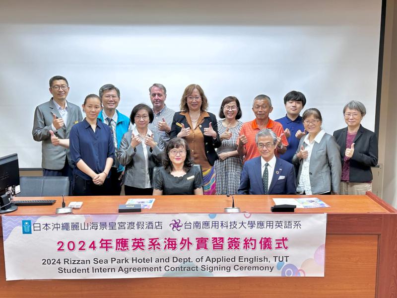 台南應用科技大學應用英語系致力培育學生實務專業技能,強化國際移動力,特與日本沖繩麗山海景皇宮渡假酒店 (Rizzan Sea Park Hotel, Okinawa) 於113年6月14日簽訂海外實習合約。該酒店重視與南應大之產學合作關係,特派森正人副社長與越智Yu執行秘書專程來台。應英系學生自今年暑假即將啟程前往該渡假酒店實習,開啟雙邊合作的濫觴。
