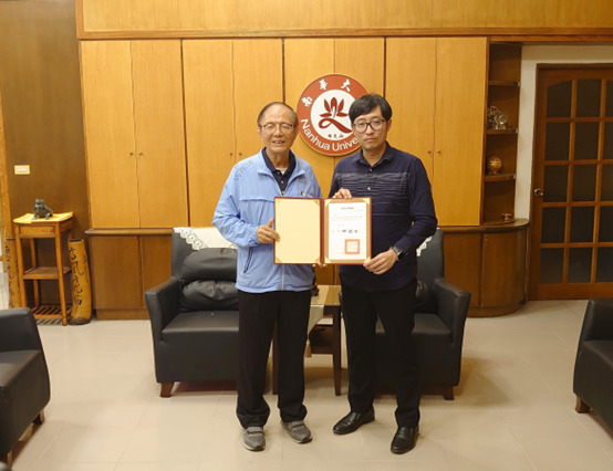 ►南華大學特聘大馬禾樂藝術及文化協會主席吳淑亮(右)擔任顧問一職,由林聰明校長(左)頒發聘書。