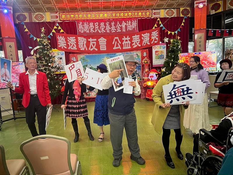 樂透歌友會志工夥伴先以《恭喜恭喜》開場,接下來再陸續演唱《變色的長城》、《願望》、《盈盈祝福》、《紫丁香》、《夜來香》、《夜空》、《真情》、《南屏晚鐘》等多首金曲老歌,榮家的長輩則歡唱了《我在你左右》及《心所愛的人》兩首歌,嫻熟的歌唱技巧及中氣十足的歌聲獲得滿堂喝采,表演活動穿插猜燈謎,為整個活動帶來高潮,長輩們踴躍猜燈謎,不管猜得對不對,總會帶來一陣歡呼,整個活動熱絡且歡樂。