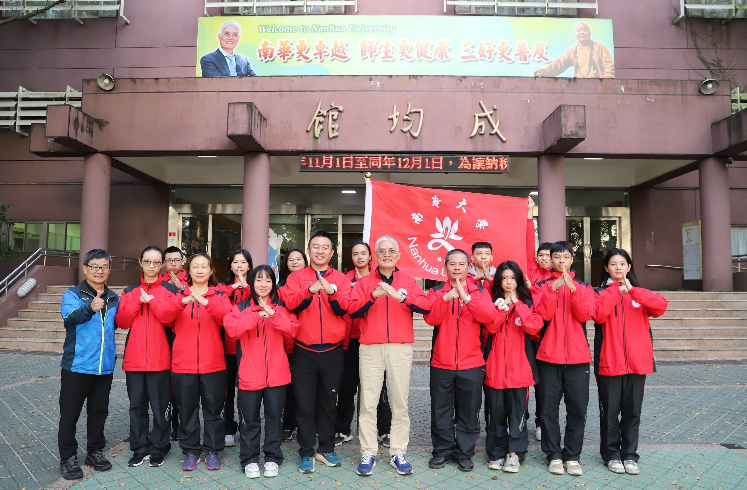 大專籃球聯賽一般女生組第四區預賽,自12月10日起在南華大學正行中心登場,身為地主隊,更希望以主場之姿展現扎實訓練成果,打出亮眼成績。國武術隊將於12月13日至14日前往文化大學參加全國大專盃武術錦標賽;女子排球隊則將於12月16日至17日在國立臺北護理健康大學出戰大專排球聯賽。為激勵運動代表隊的士氣,該校校長高俊雄分別在成均館前廣場主持授旗儀式,給予祝福與期許,並展現學校的支持與勉勵。
