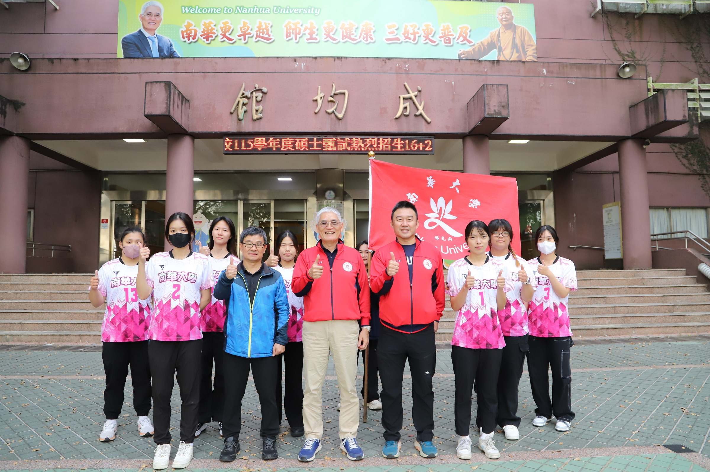 南華大學運動代表隊自12月10日起即將陸續投入全國性賽事,校長高俊雄特別於行前分別為即將出征的國武術隊、女子排球隊以及女子籃球隊等校隊授旗,為參賽選手加油打氣,展現學校對體育運動發展的高度重視與支持。
