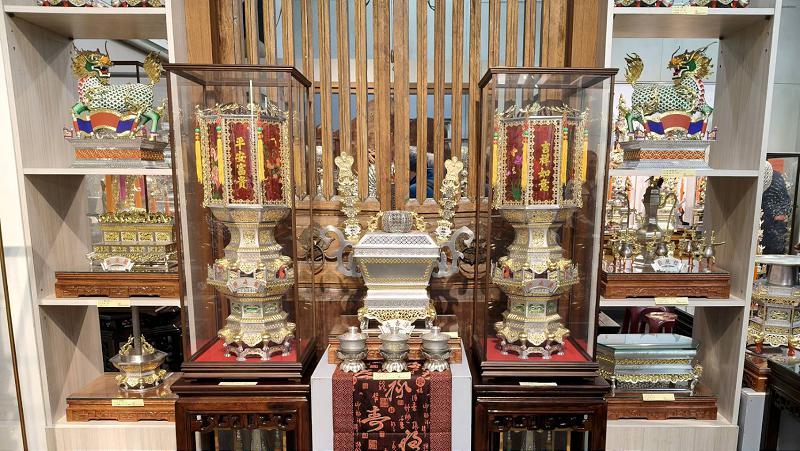 在古禮文化中,錫象徵「誠敬」,金箔寓意「尊與安」。當柔潤的金光映照冷冽的錫質,兩種金屬語言彼此呼應,如同一場靜謚而深遠的對話,在冷與暖、光與影之間,形構出一種內斂而安定的精神狀態。
