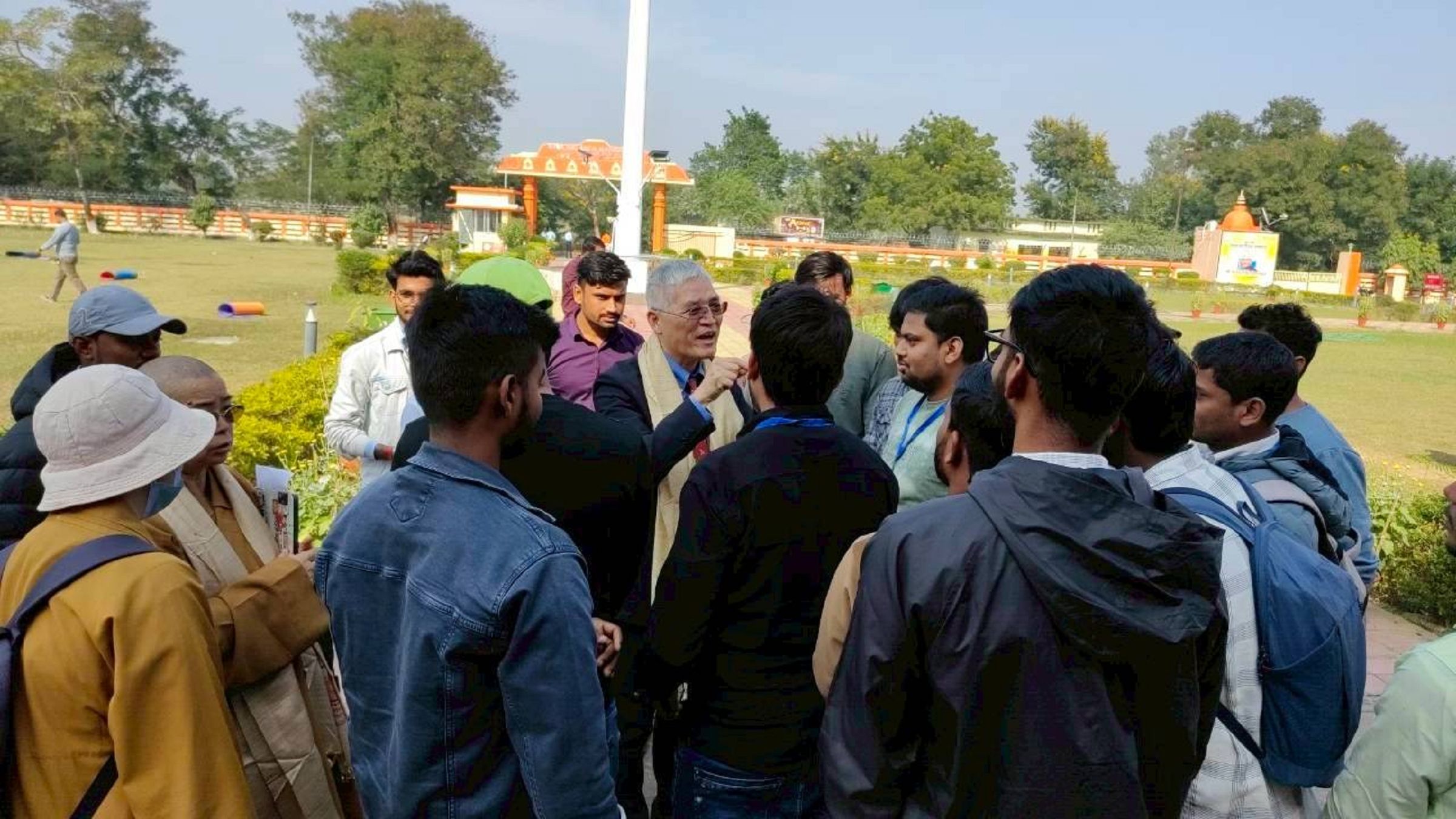 南華大學校長高俊雄表示,為拓展印度佛教交流平台,宗教所所長覺明法師於2017年曾與古印度偉大的佛教學術中心「新那爛陀大學」交流,引導多位優秀學生前來南華就讀。其中取得宗教學碩士及管理學博士學位的達喜,學成後成立「印度舍利弗旅遊公司」,並發心促進臺灣信徒前往印度佛教聖地體驗。此行亦全程陪同造訪印度聖地那爛陀、菩提迦耶之外,更前往位在新德里的印度佛光山沙彌學院、印度佛光山女子佛學院等,見證星雲大師復興印度佛教的悲心大願。