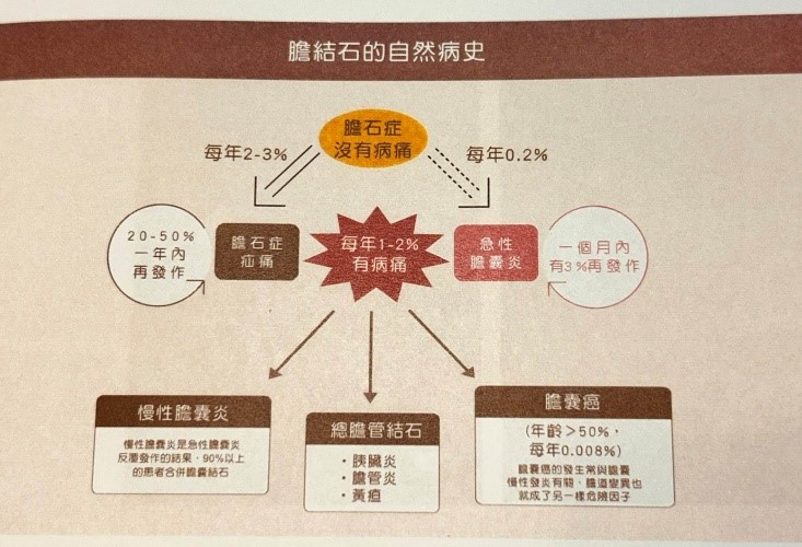 他進一步說明,膽結石的自然病程可分三階段:第一階段為飯後胃悶痛、脹氣;第二階段出現腹部絞痛,且每年復發機率約20-50%;第三階段進展為急性膽囊炎,每月發作機率約3%。