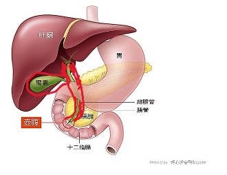 紅圈標示處為博田國際醫院肝膽胰外科副院長李金德教授為患者進行「膽囊附著處肝臟切除」及「膽管旁淋巴擴清術」手術部位示意圖