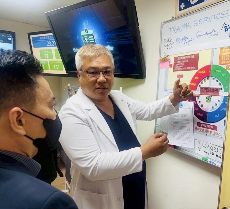 ►由外科加護室主任葉永松(外傷及重症外科主治醫師)解說並帶領胡志明醫藥大學醫院首發團參訪「急診外傷緊急救護智能工作站」,讓越方眼前一亮,對高醫在緊急救護流程中善用智慧系統爭取黃金搶救時刻,表示高度敬佩