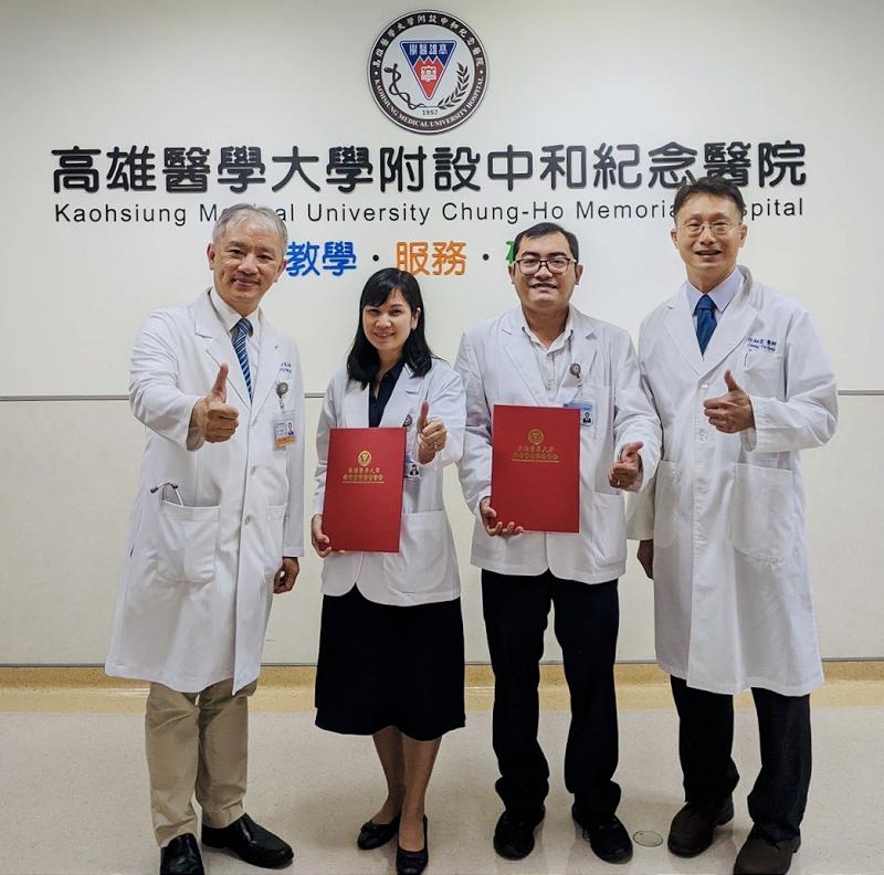 ►由高醫副院長林宗憲教授及國際醫療中心主任張鈺堂教授,頒發結業證書予來院培訓心肺運動功能測試(CPET)之胡志明醫藥大學醫院心臟內科與復健科醫師