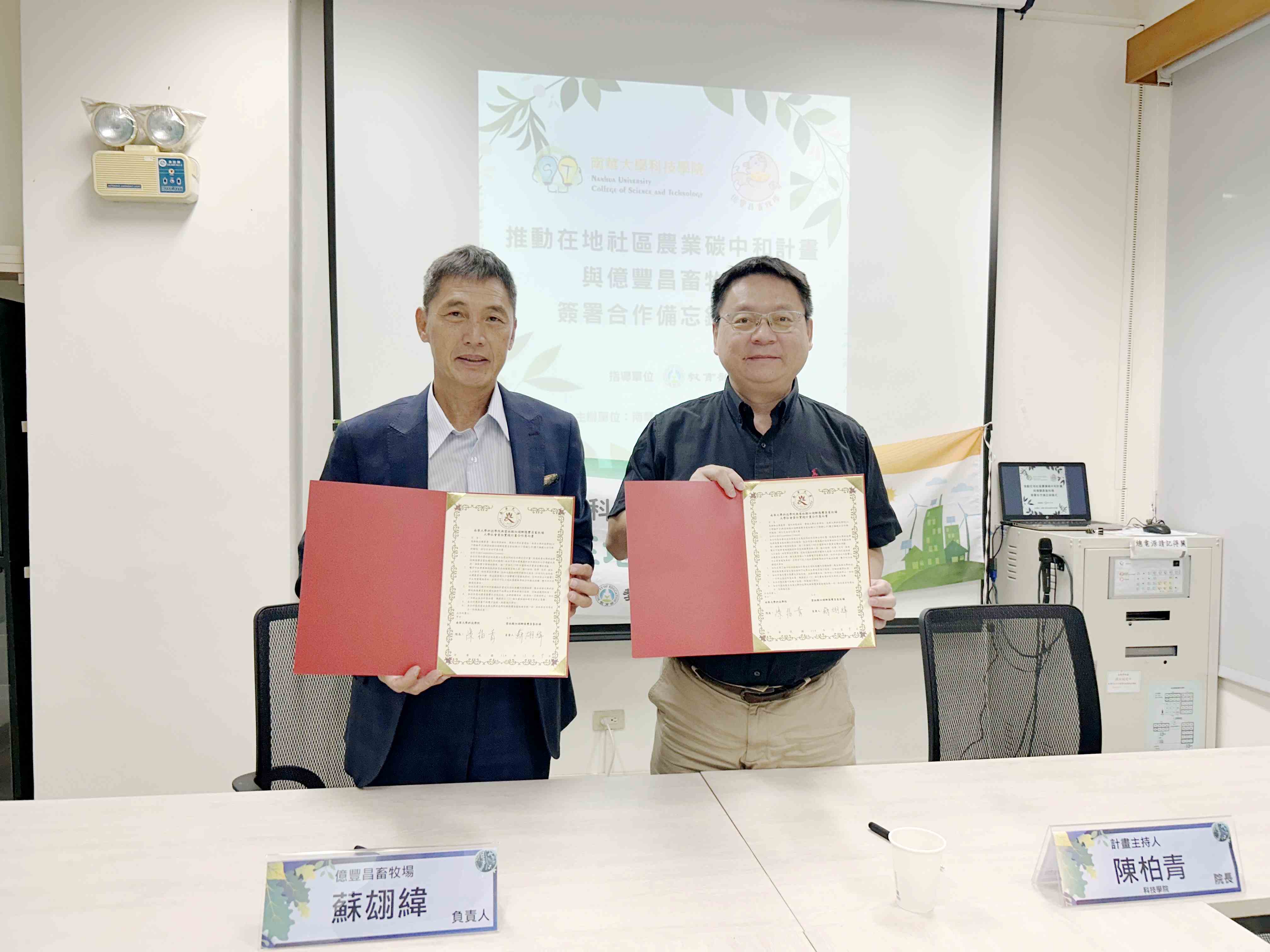►南華大學科技學院陳柏青院長(右)代表南華大學科技學院,與億豐昌畜牧場的蘇翃緯負責人(左),簽訂合作備忘錄並合影留念。