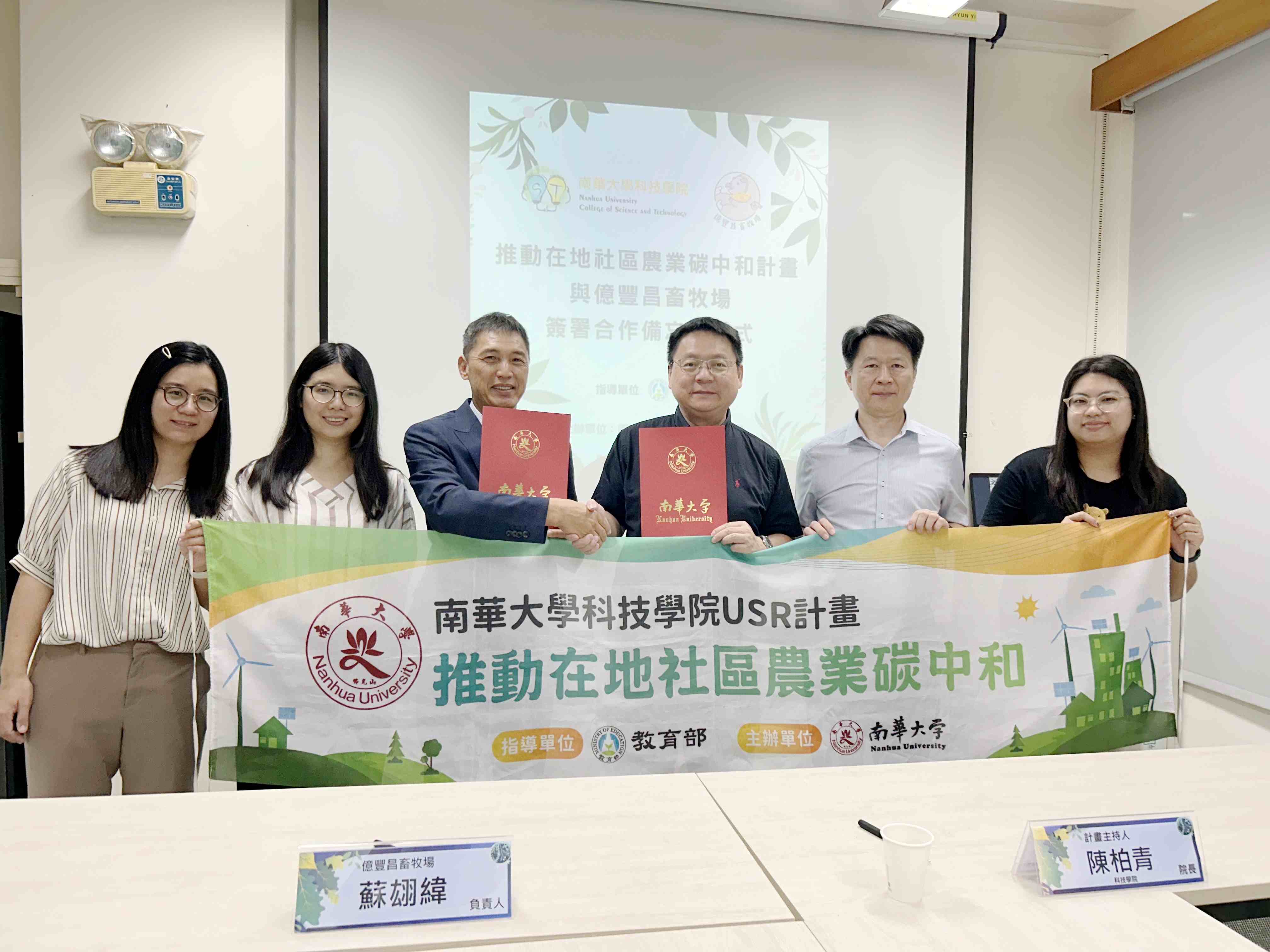 南華大學科技學院USR「推動在地社區農業碳中和」計畫於日前與雲林縣四湖鄉的「億豐昌畜牧場」正式簽署合作備忘錄,雙方將共同推動循環農業、KKF自然農法,以及在地永續示範場域建置。簽署儀式於南華大學科技學院舉行,由南華大學科技學院院長陳柏青與億豐昌畜牧場負責人蘇翃緯,共同簽署,宣示攜手打造低碳畜牧與農業永續模式。