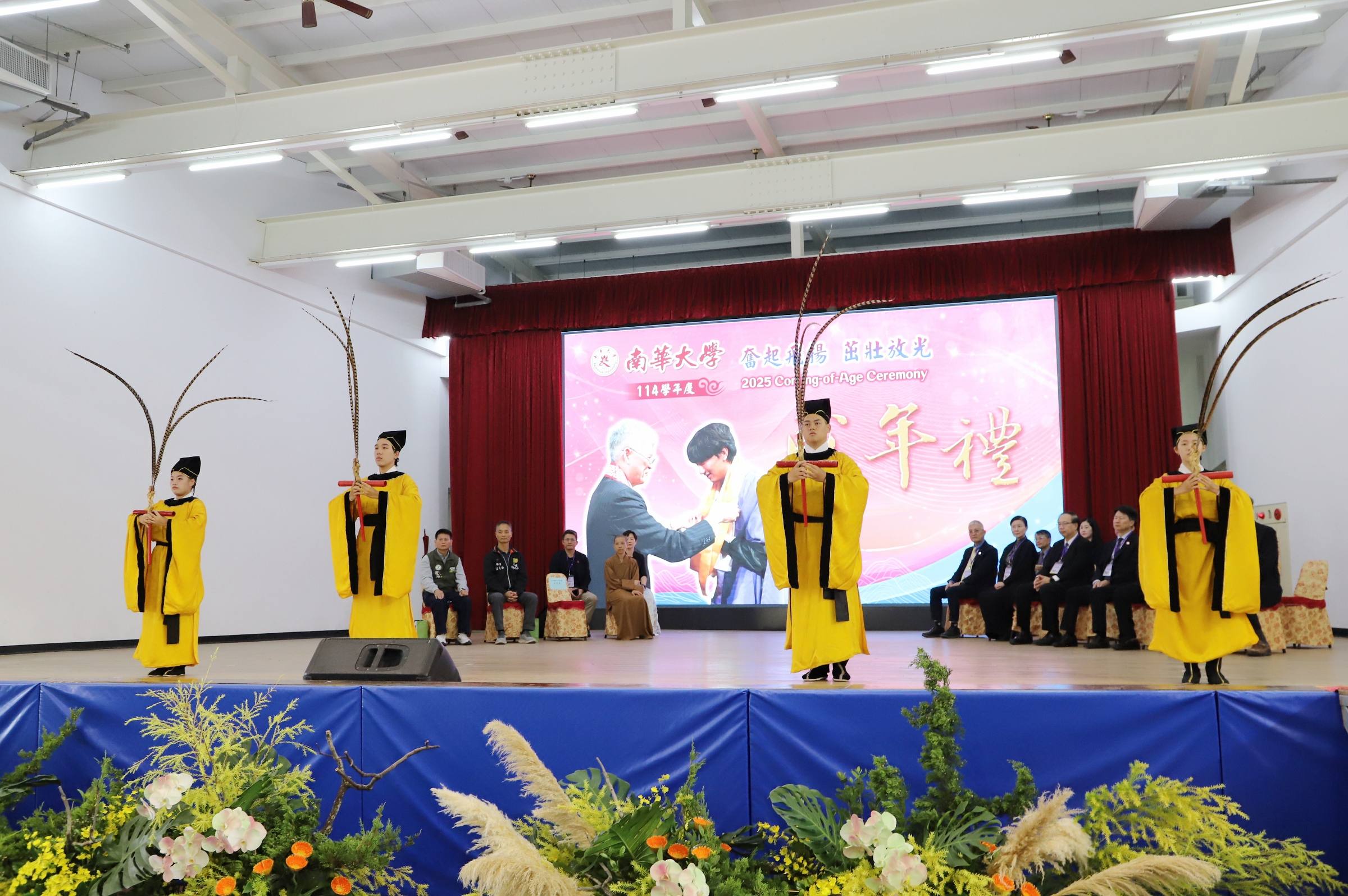 南華大學遵行古禮的成年禮別具意義,不僅讓家長見證孩子完成「轉大人」的重要時刻,更能藉此拉近親子關係。學子們也在莊嚴與溫馨交織的典禮中,帶著父母、家人以及師長的祝福,邁向人生新篇章。