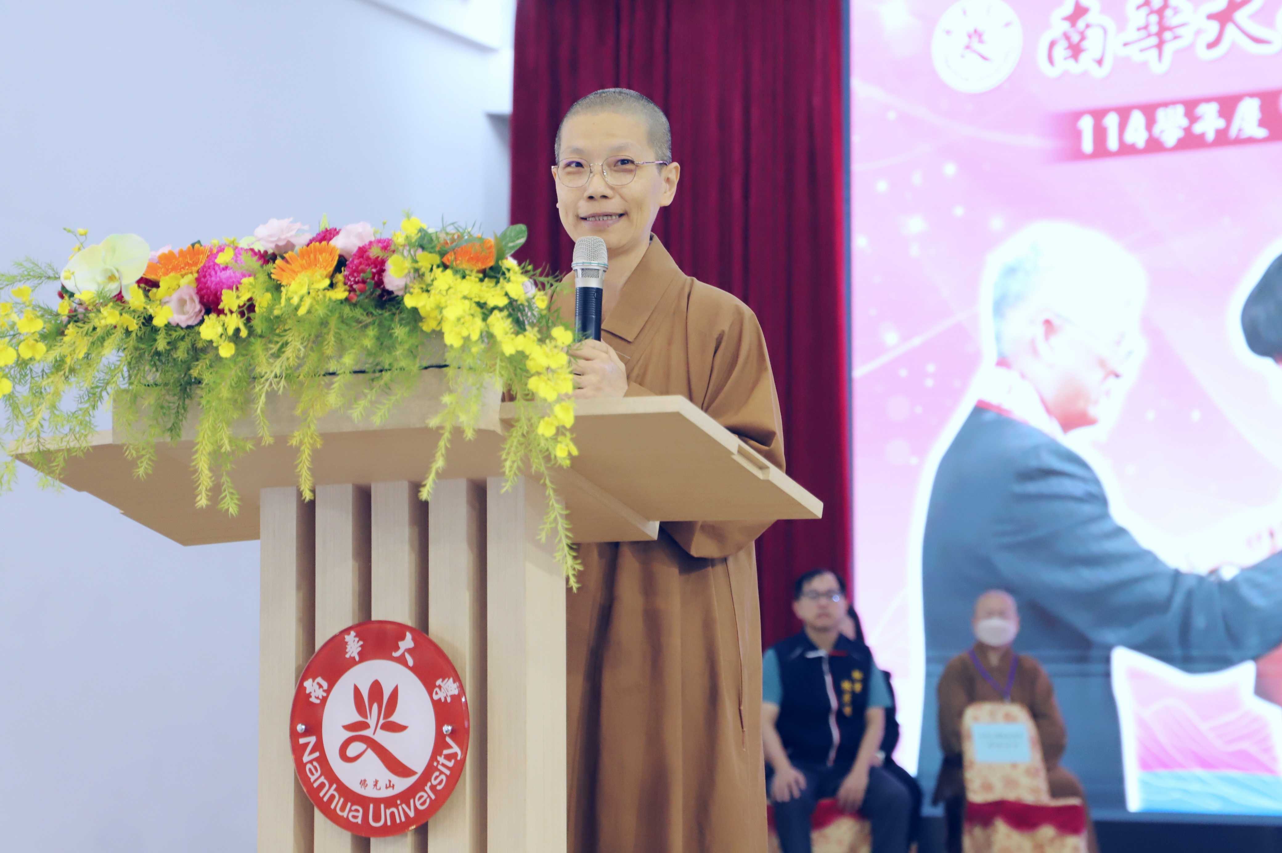該校駐校董事覺禹法師以星雲大師的智慧語錄勉勵學子要「守本分、勤奮及忍耐」,學生的本分就是要精進學習;勤奮可以廣結善緣,有善緣就會有貴人及好運;懂得學習忍耐自然有力量承擔,可以被交付更重要的工作、被器重。同時覺禹法師更鼓勵學生應多多閱讀星雲大師珍貴的智慧語錄, 將能在大師的加持下增長智慧,厚植善根福德因緣。