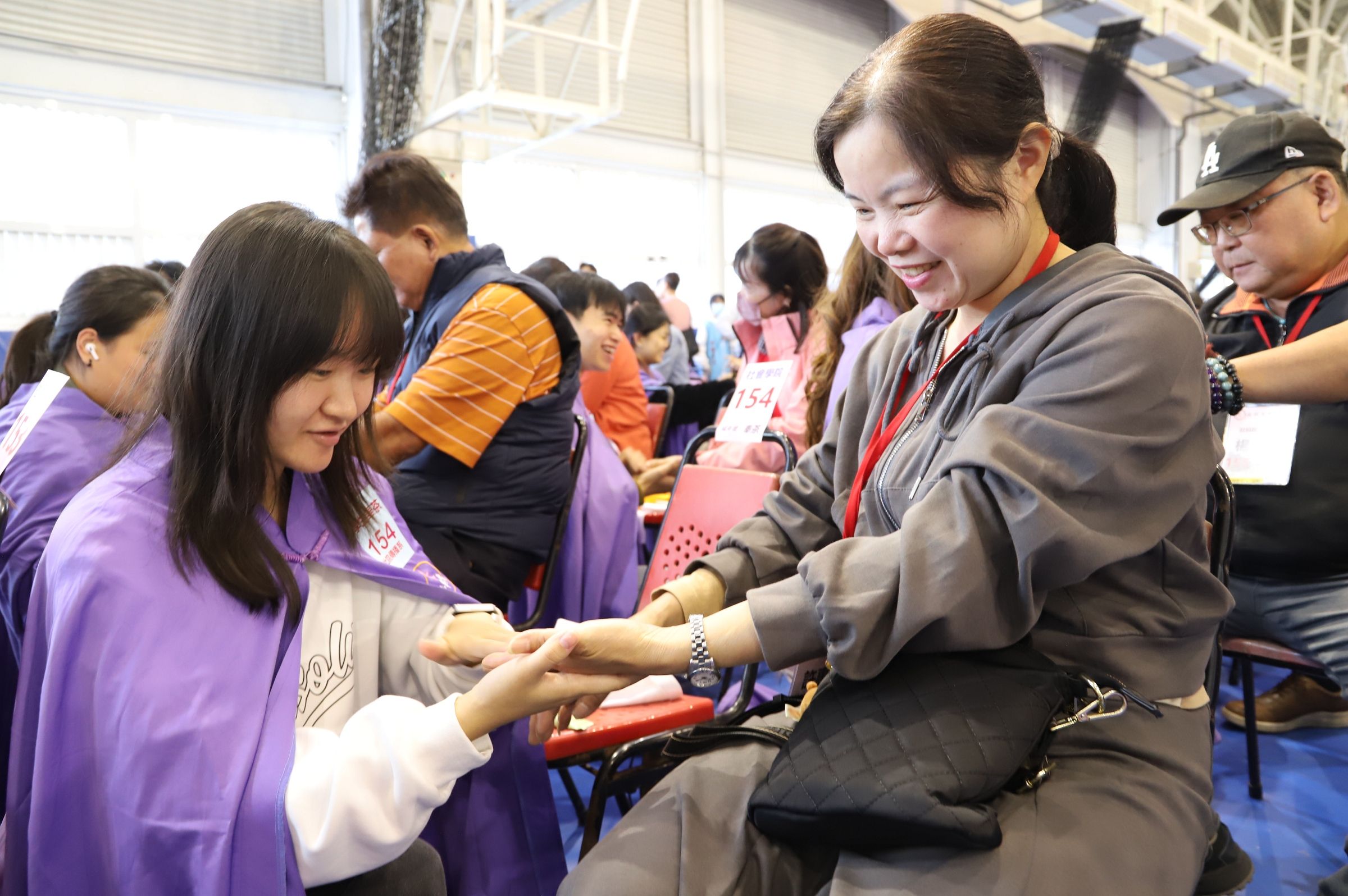 成年禮儀式從象徵淨化身心靈的「淨儀」開始,並在民族音樂學系雅樂團奏啟禮樂及「成年禮讚」之佾舞表演展開。「始加禮」首先讓孩子親自為父母擦拭護手霜,藉由具體行動感謝父母的養育之恩。家長則為孩子披上象徵純潔與成長之白巾,並聽著孩子宣讀成年誓言。「再加禮」是由師長一一為學生披上象徵祝福輝煌騰達的黃巾,「三加禮」則由貴賓致贈祝福成年的小禮物。就讀傳播系的林育慈因成骨發育不全症行動不便,高俊雄校長特別至台前為她披巾。身體的病痛並沒有阻礙她追夢,更在廣播電台節目中找到力量,如今亦踏入傳播領域的學習,期許未來能藉由聲音溫暖他人。成年禮不僅是她的里程碑,也是父母多年守護的見證。成年禮儀式莊嚴而溫馨,家長們和孩子互擁,感動的淚水成了最真摯的祝福,場面溫馨感人。
