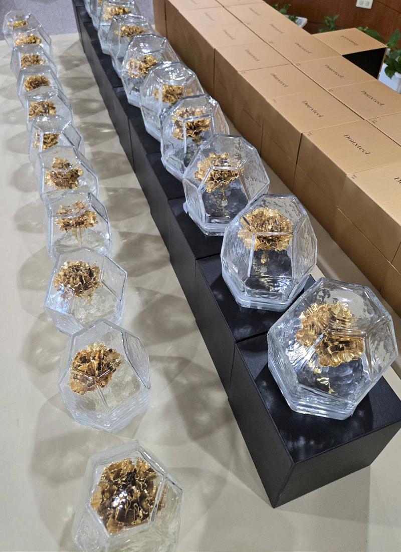 1964年成立的台南應用科技大學今年滿60周年,創校當年的台南家專有新娘學校美譽,是早年名門望族挑選媳婦的對象,所有名媛閨秀競相搶讀;隨著時間遞嬗,該校於86年升格為台南女子技術學院,95年由教育部核定改名為台南科技大學、並於99年更名為台南應用科技大學。今年度獲頒傑出校友的澄式設計創辦人林洧緹,實實在在發揮母校以「文創的搖籃、藝術的殿堂」為教學目標的精神,將在學校五專美工科的藝術養分及二技視傳系的設計美學融合,將母校交付的永生校花任務完美呈現。 接到永生康乃馨設計任務的林洧緹表示:「感謝母校給她這個機會,讓她能夠將在學校所學技能應用在這個具有歷史意義的作品上,南應大對她來說就像是一位母親細心呵護、用心教導她,讓她不僅將基本功打得非常紮實之外,還學習多媒材應用及天馬行空的設計訓練,因此激發出源源不絕的創意靈感,將代表母親的校花康乃馨以真花鍍24K金的特殊技術,將花朵保留在最美麗的瞬間,每一朵花都是獨一無二的創作,就如同學校訓練出來的人才,永遠是獨一無二存在,放置於外型如同鑽石般的口吹玻璃裡閃耀別緻。」