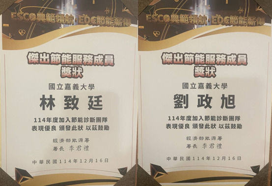 值得一提的是,嘉大EDC團隊在114年底推薦機械與能源工程學系碩士班研究生林致廷與生物機電工程學系碩士班研究生劉政旭參加「EDC節能診斷服務中心傑出服務成員評選」,雙雙入選全國前六強。成果發表會中,兩位同學向各界展示其參與多元產業節能診斷之專業成果,並與經濟部能源署李君禮署長合影留念,不僅為個人學習歷程留下重要里程碑,也為嘉大未來持續爭取相關計畫與資源布局,增添關鍵優勢。