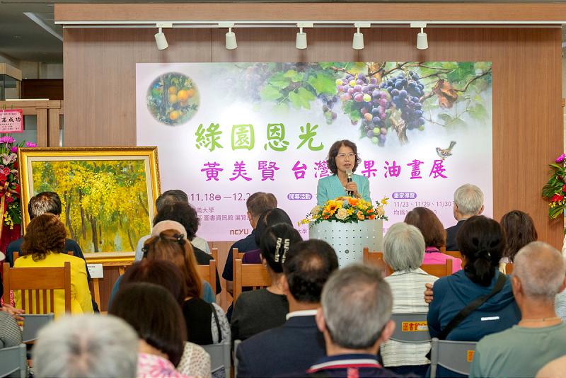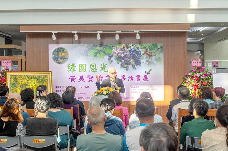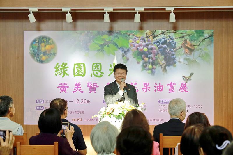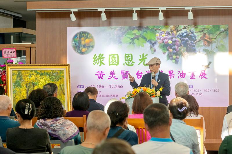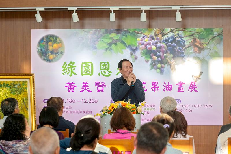 《綠園恩光─黃美賢台灣花果油畫展》即日起於嘉義大學圖書資訊館一樓展覽廳展出至12月26日,並於11/29(六)、11/30(日)及12/25(聖誕節)舉行三場假日導覽(時間均為14:00至15:00),再次由黃美賢博士親自導覽。邀約大家把握機會蒞臨欣賞。#P10►黃美賢博士於嘉大圖書資訊館展區留影。