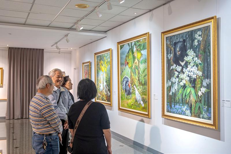 本次展出50件田園花果油畫,呈現台灣北中南東四季花果之美,並加入雞、鴨、鳥等田園題材,展現生機盎然的自然意象。作品兼具寫實與抒情氛圍,展區動線明亮清爽,深受來賓好評。黃博士於開幕亦提供生動導覽,以深入淺出的方式解析作品形式與內涵象徵,並分享田園素材採集的趣事,現場互動熱烈。