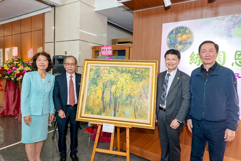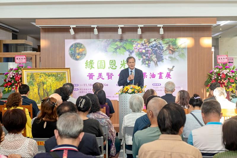 嘉義大學創校106週年校慶重點特展《綠園恩光──黃美賢台灣花果油畫展》11月22日在蘭潭校區圖書資訊館隆重開幕。中央與地方農業文化官員、藝文人士、嘉大師生及各校友會代表熱烈參與,現場氣氛溫馨熱烈,展現高度關注。