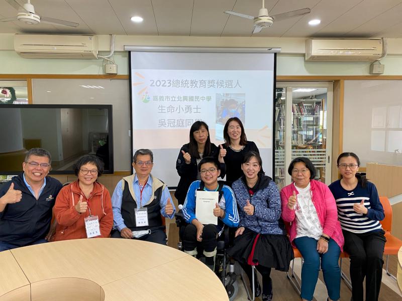 教育部日前公布2023年總統教育奬56名得主名單,嘉義市北興國中三年九班學生吳冠庭是今年雲嘉嘉南地區唯一榮獲總統教育奬的學生,冠庭即使面對身體先天性病痛,仍然秉持著嘉義人永不放棄的精神,樂觀面對,並在導師及父母一路陪伴下,積極的探索自我,一展長才!
