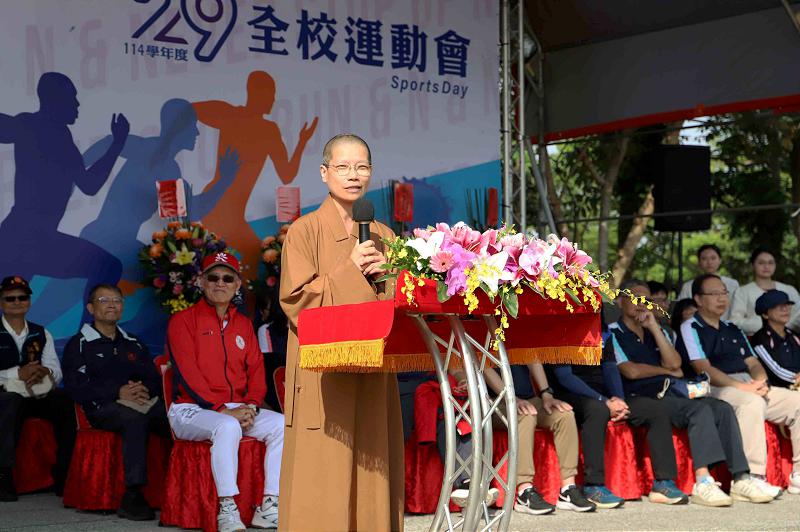 南華大學駐校董事覺禹法師相當肯定高俊雄校長這一年多以來的辦學,帶著南華持續成長,展現優異的辦學績效。同時亦強調南華從籌備創校迄今,董事會長期以來不斷地投入資金與資源,未來也將持續全力支持學校推展各項校務。因此,勉勵教師要提升研究能量、學生也要不斷精進、提升競爭力,要讓全世界看見南華的亮點。此外,也鼓勵大家要把運動融入日常生活中,擁有健康的身心靈,才能開創美好的人生。運動會當天,適逢UBL大專棒球運動聯賽,覺禹法師請全體師生一起為棒球隊加油打氣,期能創下隊史最佳成績抱回冠軍獎座。