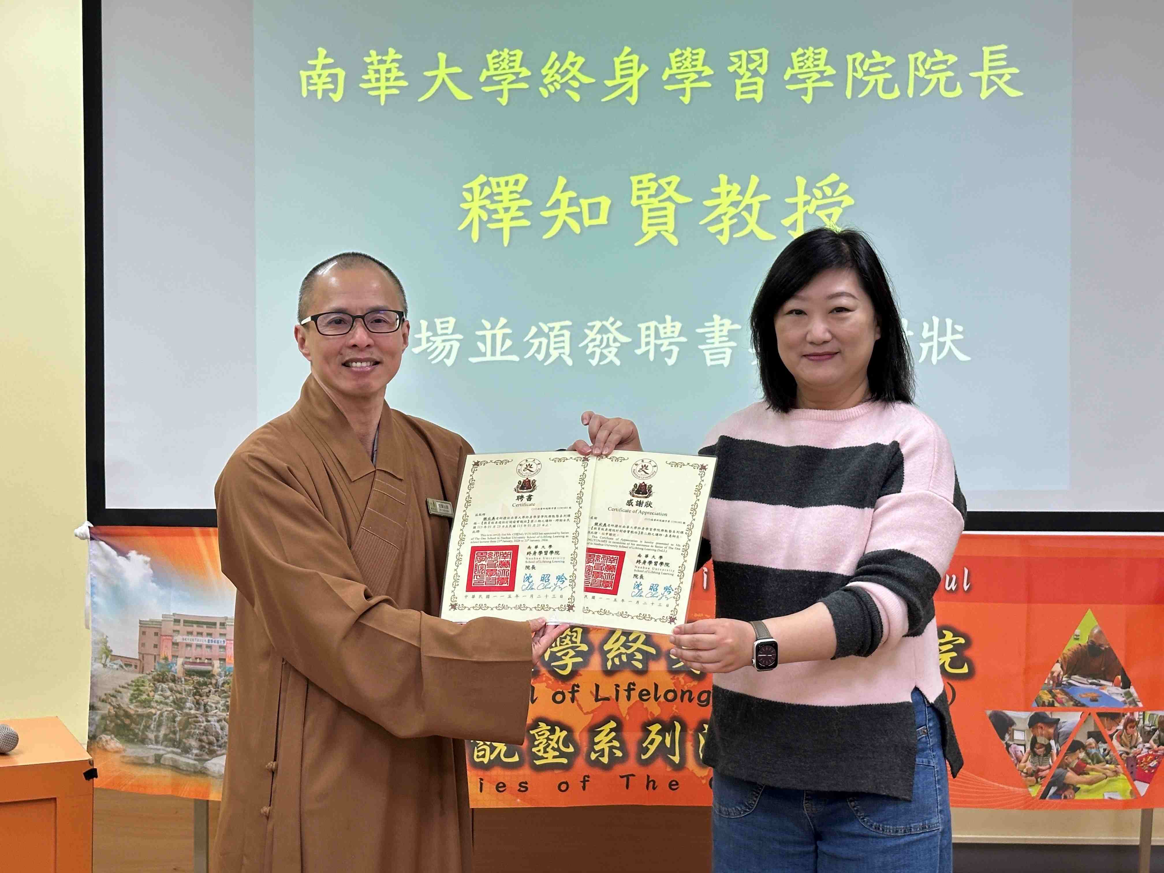 ►教育版桌遊設計開發實戰班」第二期開班,南華大學終身學院院長釋知賢(左)頒發聘書及感謝狀予程云美老師(右)。